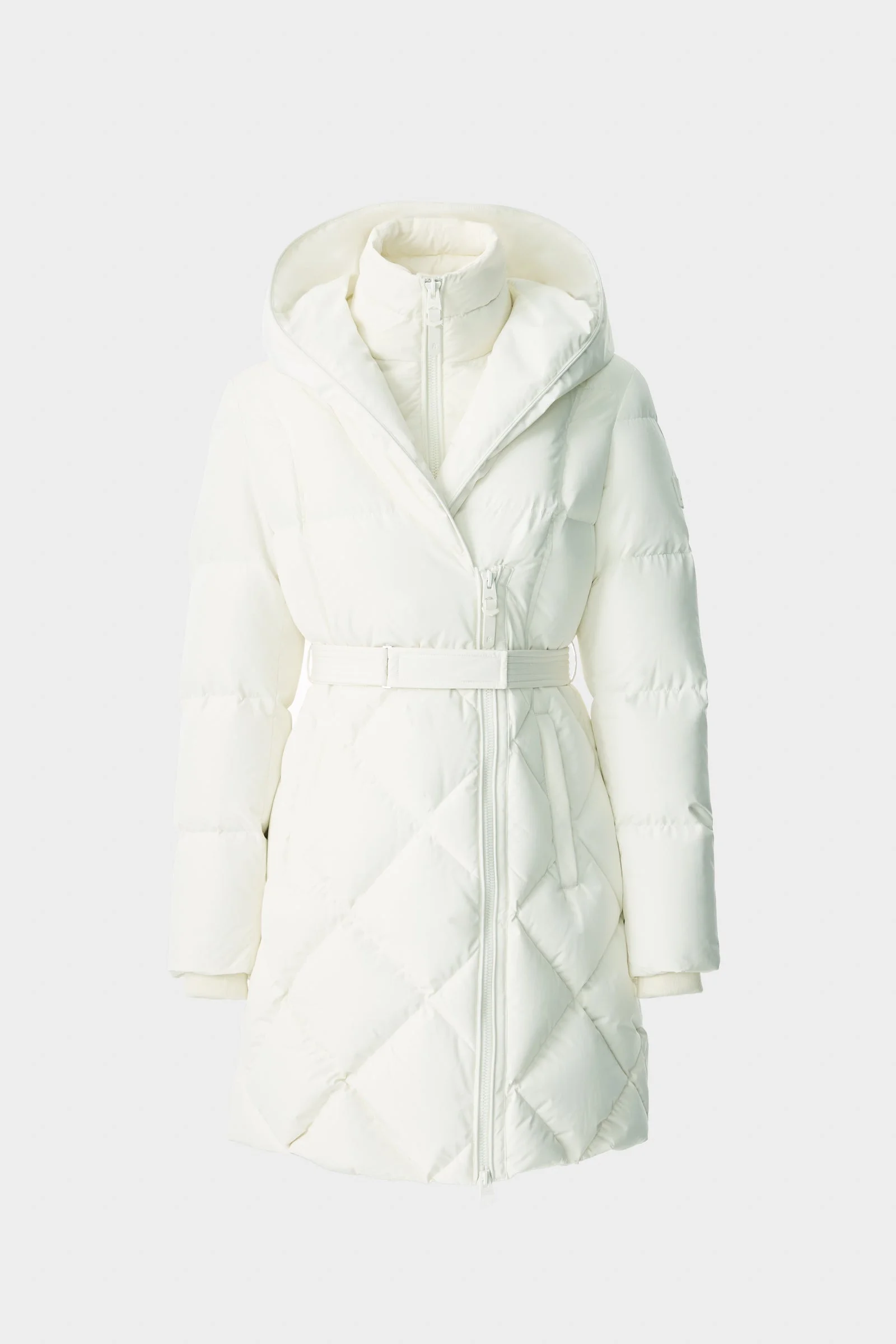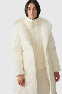 AYUMI is a 2-in-1 long down coat crafted from recycled materials and filled with GRS-certified down. Featuring a removable inner bib in lightweight down, the design offers customizable protection in extreme cold. Diamond quilting at lower body with an adjustable belt, and a dramatic wrap-style collar blend form and function. A hidden toggle at the hood opening, rib knit storm cuffs, and welt zip pockets complete this refined cold-weather essential. DETAILS - 2-in-1 long belted down coat - Water-resistant, repellent, and windproof - GRS-certified recycled down - Removable lightweight down bib - Diamond quilting at lower body - Channel quilting throughout - Asymmetrical front zip closure - Adjustable belt at waist - Insulated waist pockets with zipper opening - Inner welt pocket with zipper - Rib knit storm cuffs - Hidden toggle at hood - Fully insulated - Temperature Rating: -20°C SIZE & FIT - FITTED – Our signature fit, closest to the body. - Designed to be worn with light layers, all while keeping you warm. - For heavier layering, we recommend sizing up. - The model is 5'11" (180 cm) and wears a size S. - Coat length from shoulder to hem: 35.25'' / 90 cm. COMPOSITION & CARE - Shell: 100% recycled polyester. Lining: 100% recycled polyester. Filling: 90% recycled down, 10% recycled feathers. Water-repellent, water-resistant. - Close zippers. Remove fur. Remove all removable trims. Wash inside out. Wash in domestic machine in water not exceeding 40°C, at normal setting. use mild detergent. Remove immediately after washing. Do not soak. Tumble dry low heat with tennis balls, until fully dried (1 to 3 hours). Do not wet-clean. Do not bleach. Do not wring. Do not iron or press. Dry clean using oil based solvent only. Do not use perchloroethylene.