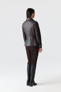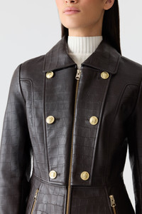 BARBARA-NV is a fitted jacket crafted from 100% lamb leather with a croc-embossed patterned finish. Featuring a peplum hem for a sculpted silhouette, it is fully lined and designed with a wide collar and double-breasted front. Adjustable sleeve tabs with buttons and zippered pockets add both functionality and elevated detailing. DETAILS - Fitted leather jacket - 100% lamb leather with croc-embossed patterned finish - Peplum hem - Wide collar with double-breasted closure - Center front zipper closure - Adjustable sleeve tabs with buttons - Zippered front pockets - Gold hardware - Fully lined SIZE & FIT - FITTED – Our signature fit, closest to the body. - Designed to be worn with light layers, all while keeping you warm. - For heavier layering, we recommend sizing up. - The model is 5'11" (180 cm) and wears a size S. - Coat length from shoulder to hem: 24.25'' / 62 cm. COMPOSITION & CARE - Shell: 100% lamb leather. Lining: 100% polyester. - Dry clean by leather specialist using oil based solvent only. Do not use perchloroethylene.