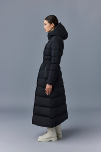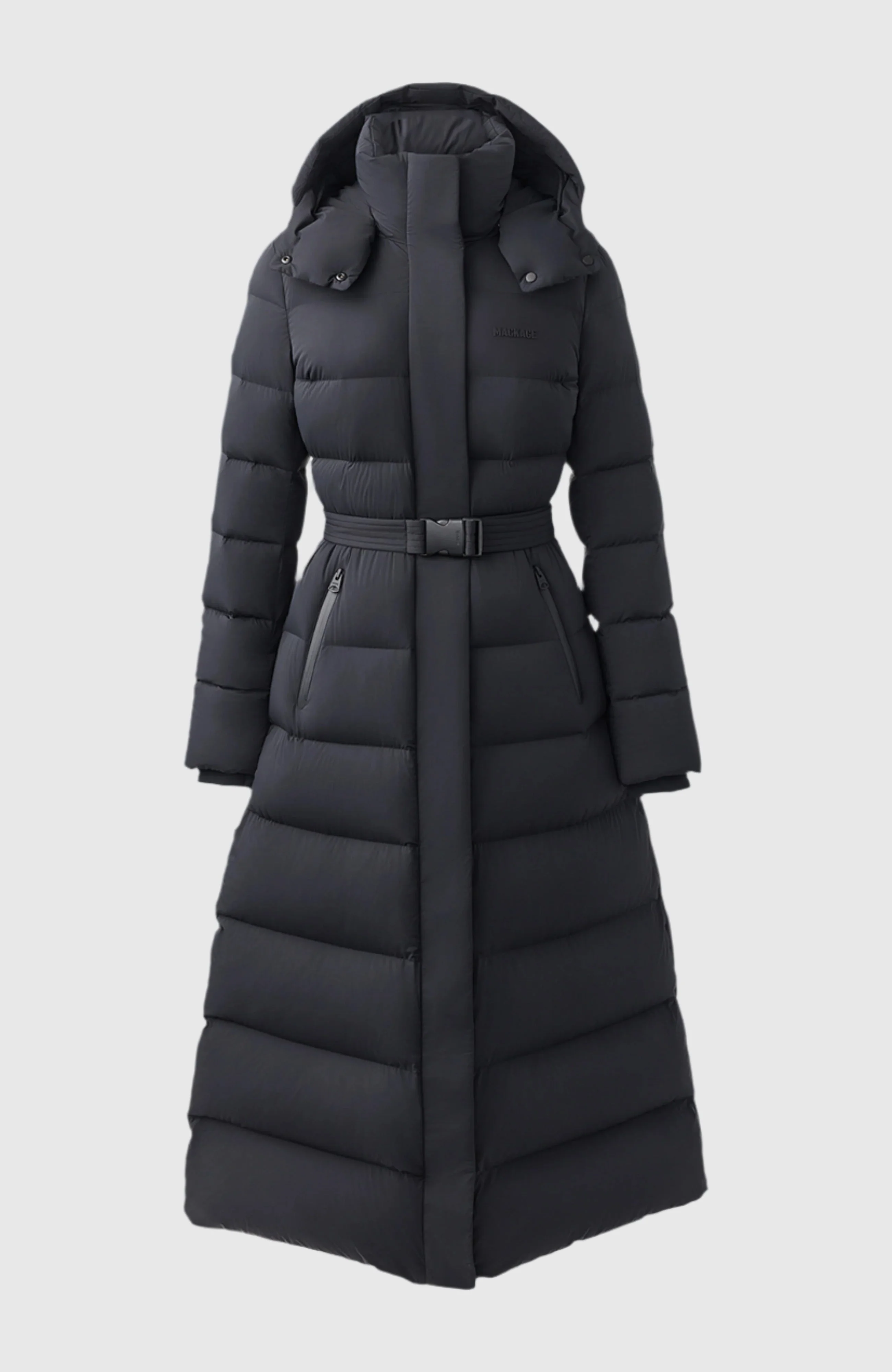 CALINA-CITY is a longline coat for women crafted from recycled down. Flaunting a close-to-body fitted cut, the press-release fastening belt enhance the statement silhouette. The adjustable storm visor hood, insulated pockets, and rib knit cuffs bring signature performance. Finished with a storm placket for added protection. DETAILS - Long down coat - 100% recycled down - Nylon shell - Box quilting throughout - Hood with adjustable drawcord storm visor - Pillow collar - Centre front zip closure - Adjustable belt with press-release fastening - Insulated zip welt pockets - Inside zip pocket - Rib knit storm cuffs - Signature logo at chest - Machine washable - Signature closest-to-the-body fit SIZE & FIT - FITTED – Our signature fit, closest to the body. - Designed to be worn with light layers, all while keeping you warm. - For heavier layering, we recommend sizing up. - The model is 5'11" (180 cm) and wears a size XS. - Length from shoulder to hem: 54'' / 137 cm. COMPOSITION & CARE - Shell: 82% recycled nylon, 18% elastane/spandex. Combo: 82% polyester, 18% elastane/spandex. Lining: 82% recycled nylon, 18% elastane/spandex. Filling: 90% goose down, 10% feathers. Water-repellent & Water-resistant. - Dry clean by leather specialist using oil-based solvent only. Do not use perchloroethylene.