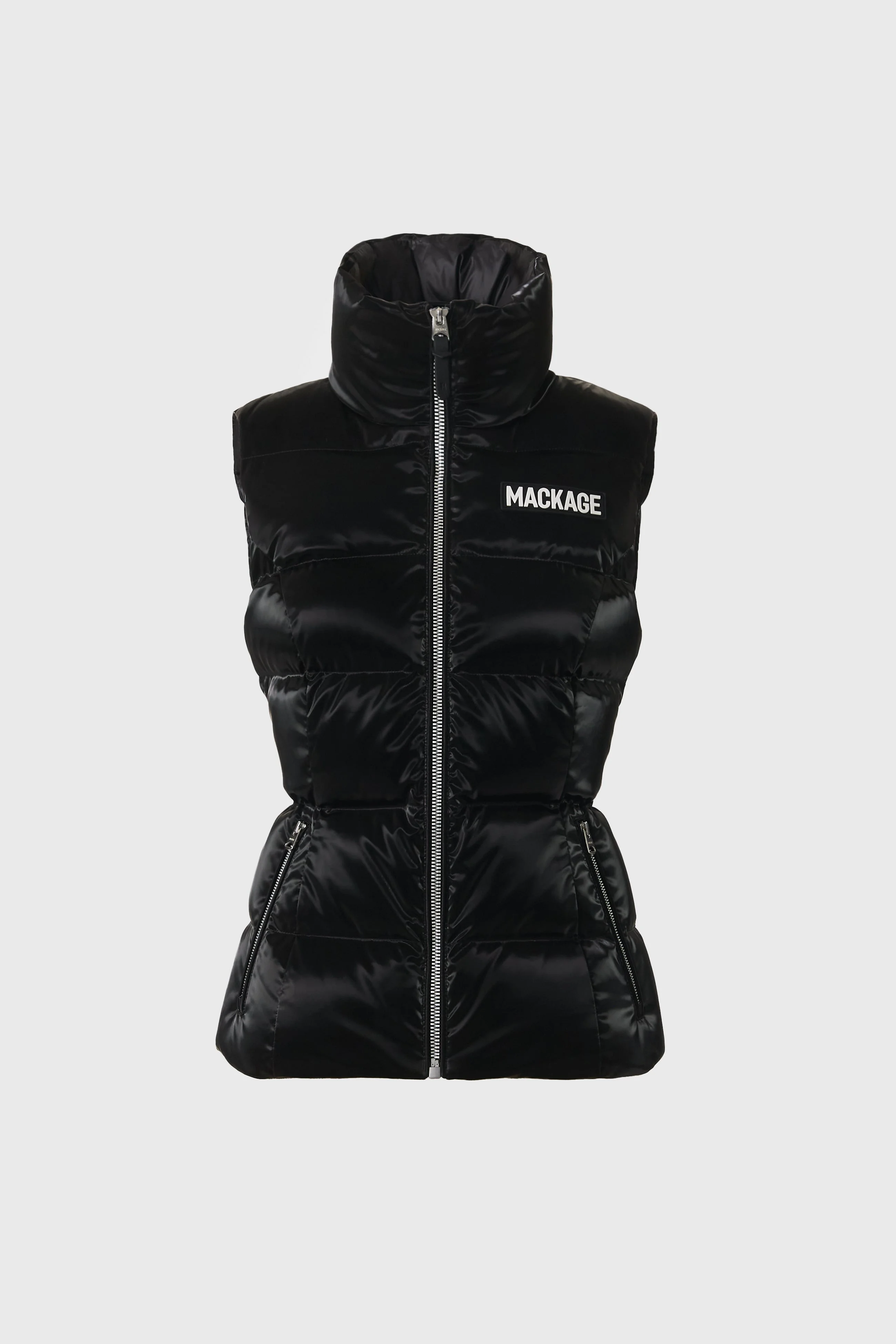 CHAYA-GLO is a fitted down vest designed for transitional layering in a high-gloss shell. Crafted with GRS certified recycled down, it features zippered pockets for secure storage, a clean center front zipper closure, and a stand collar for added protection. A contrast “MACKAGE” patch on the chest finishes this essential cold-weather piece with signature style. DETAILS - High-gloss down technical vest - GRS-certified recycled down - Center front zipper closure - Stand collar - Pockets with zippers - Inside pocket - Fully lined - “MACKAGE” black/white patch on left chest - Machine washable - Temperature rating: 0°C SIZE & FIT - FITTED – Our signature fit, closest to the body. - Designed to be worn with light layers, all while keeping you warm. - For heavier layering, we recommend sizing up. - The model is 5'11" (180 cm) and wears a size S. - Coat length from shoulder to hem: 24.25'' / 58 cm. COMPOSITION & CARE - Shell: 100% polyurethane. Lining: 100% recycled nylon. Filling: 85% recycled down, 15% recycled feathers. Water-repellent, water-resistant. - Close zippers. Remove fur. Remove all removable trims. Wash in domestic machine in water not exceeding 30°C at delicate gentle setting. Wash inside out. Use mild detergent. Remove immediately after washing. Do not soak. Tumble dry at low heat with tennis balls until fully dried (1 to 3 hours). Do not wet-clean. Do not bleach. Do not wring. Do not iron or press. Do not steam. Do not dry clean.