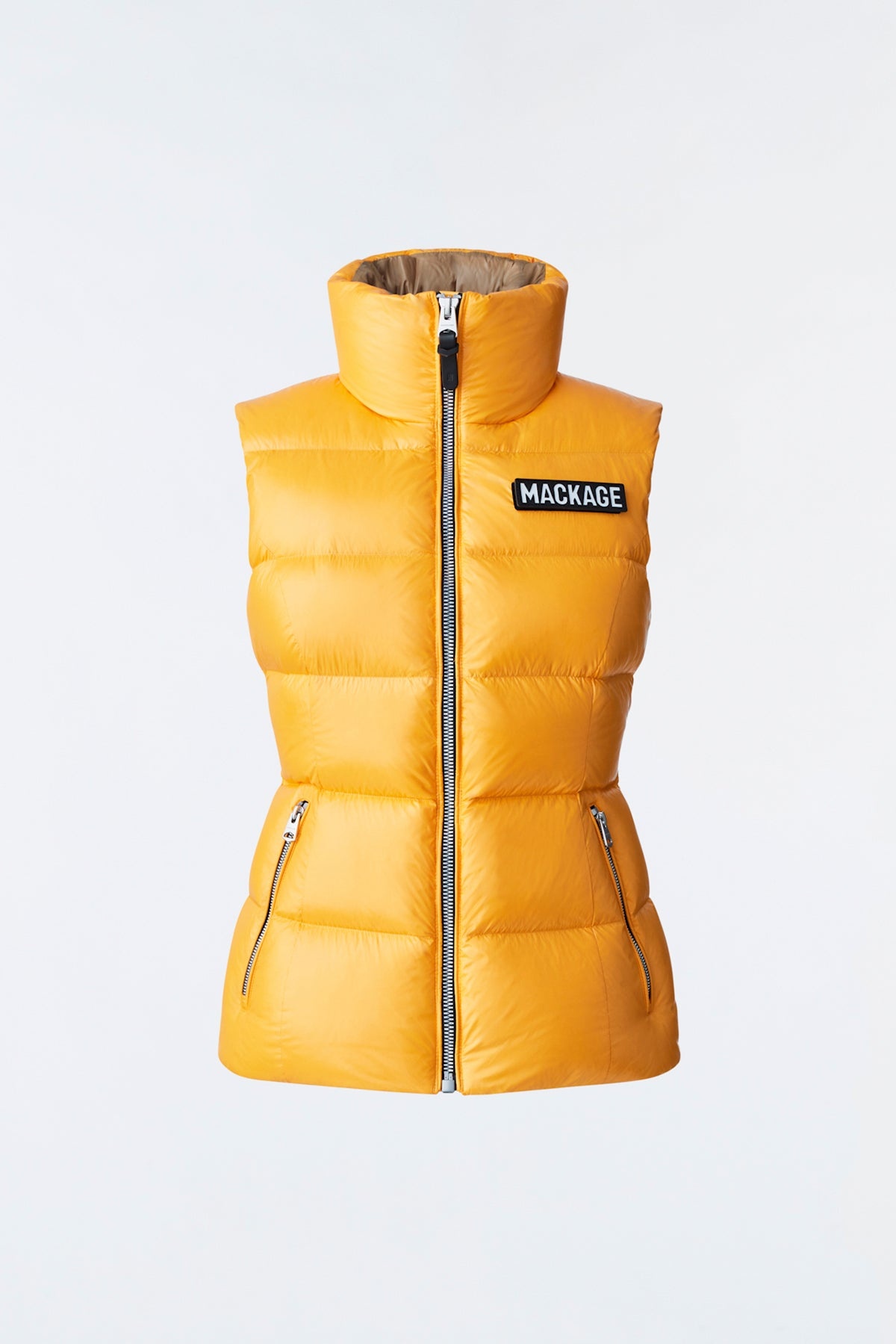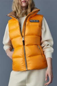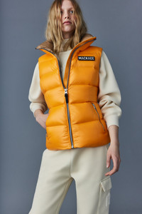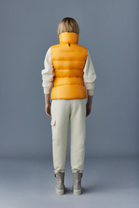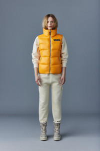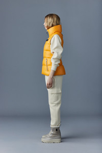 CHAYA is a recycled light down vest for women with a streamlined silhouette. Meticulously made from a high-sheen shell that is perfectly warming, it shows paneled channel quilting. The generous funnel collar and zip waist pockets bring comfort on cooler days. Detailed with a signature wordmark patch and contrast lining. - Light nano down vest - 100% recycled down - Lustrous nylon shell - Channel quilting - Funnel collar - Centre front zip closure - Zip waist pockets - Contrast lining - Signature wordmark patch on left sleeve - Machine washable - Signature closest-to-the-body fit SIZE & FIT - FITTED – Our signature fit, closest to the body. - Designed to be worn with light layers, all while keeping you warm. - For heavier layering, we recommend sizing up. - Coat length from shoulder to hem: 24'' / 60.96 cm. COMPOSITION & CARE INSTRUCTIONS - Shell (Woven): 100% polyamide/nylon. Lining (Woven): 100% polyamide/nylon. Filling: 90% white duck down, 10% feathers. Water-repellent & water-resistant. - Close zippers. Remove fur. Remove leather zipper puller. Wash inside out. Wash in domestic or commercial machine in water not exceeding 40°c, at normal setting. Use mild detergent. Remove immediately after washing. Tumble dry low heat with tennis balls, until fully dried (1 to 3 hours). Do not soak. Do not wet-clean. Do not bleach. Do not wring. Do not iron or press. Do not dry clean.