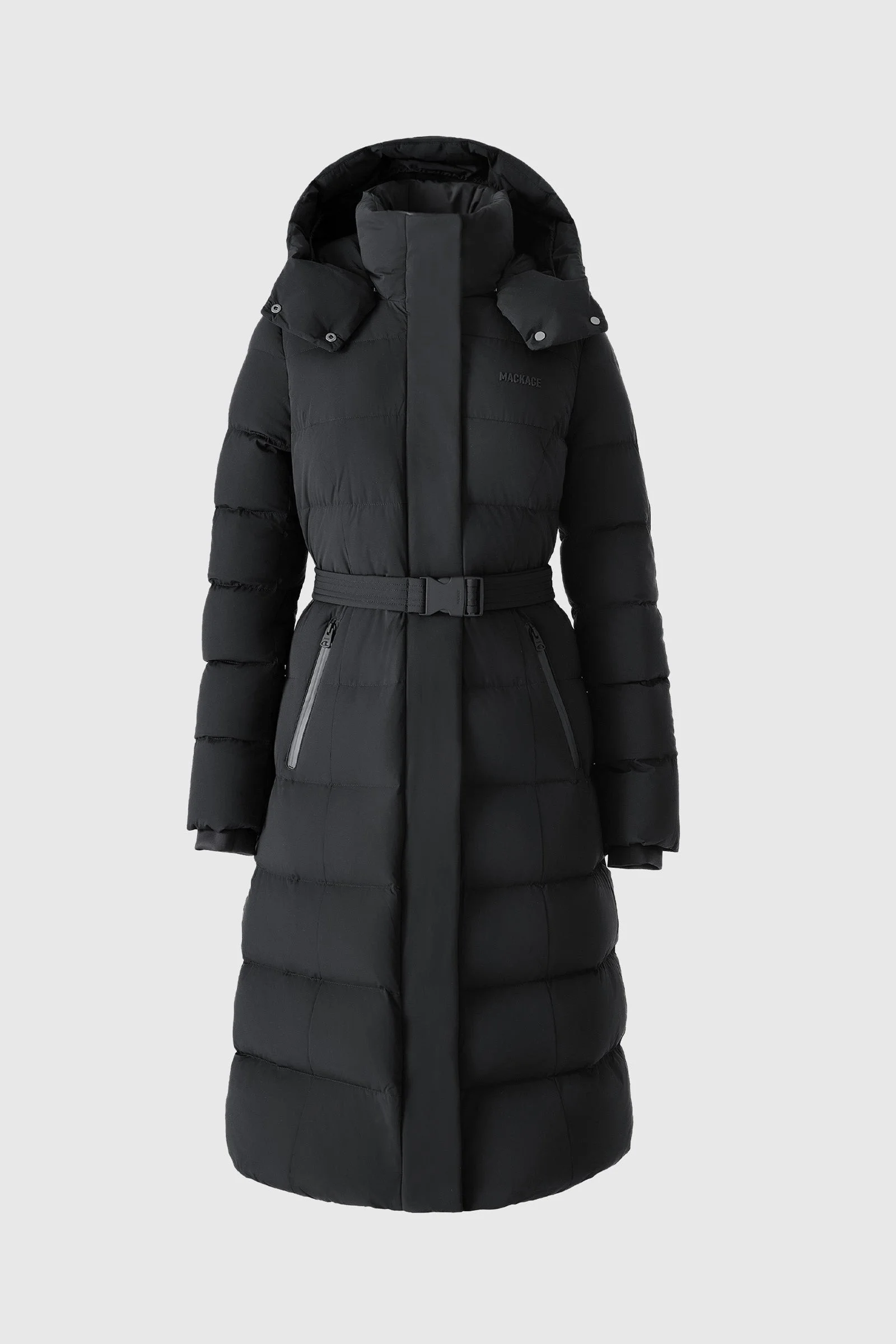 CORALIA-CITY is a fitted, long down coat engineered for cold-weather protection without the bulk. Featuring a water-resistant zipper at the center front and pockets, this streamlined silhouette includes a hood with an adjustable storm visor, insulated interior, and storm cuffs. A removable belt with buckle allows for a customizable cinch at the waist, while the recycled down fill ensures superior warmth. Finished with “MACKAGE” silicone branding on the chest for signature appeal. DETAILS - Long down coat in matte finish - Center front zipper and placket with hidden snaps - Water resistant zipper at center front and pockets - Hood with adjustable storm visor - Adjustable hood opening with bungee cord and stopper - Adjustable belt with buckle - Fully lined - Rib knit cuffs - Inner welt pocket with zipper - Insulated pocket - Quilted sleeves and quilted body - “MACKAGE” silicone branding on chest - Storm cuffs - Machine washable - Temperature rating: -15°C SIZE & FIT - FITTED – Our signature fit, closest to the body. - Designed to be worn with light layers, all while keeping you warm. - For heavier layering, we recommend sizing up. - The model is 5'11" (180 cm) and wears a size S. - Coat length from shoulder to hem: 42'' / 51 cm. COMPOSITION & CARE - Shell: 82% recycled nylon, 18% elastane/spandex. Lining: 82% recycled nylon, 18% elastane/spandex. Filling: 90% recycled down, 10% recycled feathers. Water-repellent, water-resistant. - Dry clean by leather specialist using oil based solvent only. Do not use perchloroethylene.