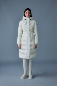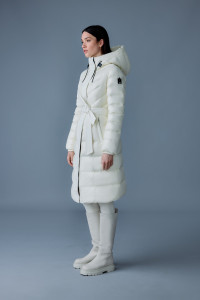 CORALIA is a weightless recycled down coat for women with a hood, and sash belt closure for customizable comfort. Machine washable and water resistant and repellent, storm cuffs and a drawcord-adjustable storm visor with a pillow collar deliver weathergrade protection. Safely store essentials with an inside pocket and welt pockets. Engineered with technical comfort for superior warmth, a modern icon to elevate any winter outfit. DETAILS - Recycled down coat with sash belt - 800 fill power - Deep Cold: Down to -15°C - Drawcord-adjustable storm visor with pillow collar - Storm cuffs - Inside pocket - Insulated pockets - Center front zipper closure - logo on left shoulder - Machine washable - Water resistant and repellent - Fitted silhouette SIZE & FIT - FITTED – Our signature fit, closest to the body. - Designed to be worn with light layers, all while keeping you warm. - For heavier layering, we recommend sizing up. - Coat length from shoulder to hem: 43.5'' / 110.4 cm. COMPOSITION & CARE - Shell (Woven. In-visible): 100% polyamide/nylon. Combo shell 1 (placket,pockets. Woven. In-visible):100% polyester. Combo (cuffs. Knit. In-visible):70% polyamide/nylon, 22% polyester, 8% elastane/spandex. Lining (Woven. In-visible): 100% polyamide/nylon. Filling (Down): 90% chinese pure white duck down, 10% chinese duck feathers. Water-repellent & water-resistant. - Close zippers. Remove fur. Remove leather zipper puller. Wash inside out. Wash in domestic or commercial machine in water not exceeding 40°c, at normal setting. Use mild detergent. Remove immediately after washing. Tumble dry low heat with tennis balls, until fully dried (1 to 3 hours). Do not soak. Do not wet-clean. Do not bleach. Do not wring. Do not iron or press. Do not dry clean.