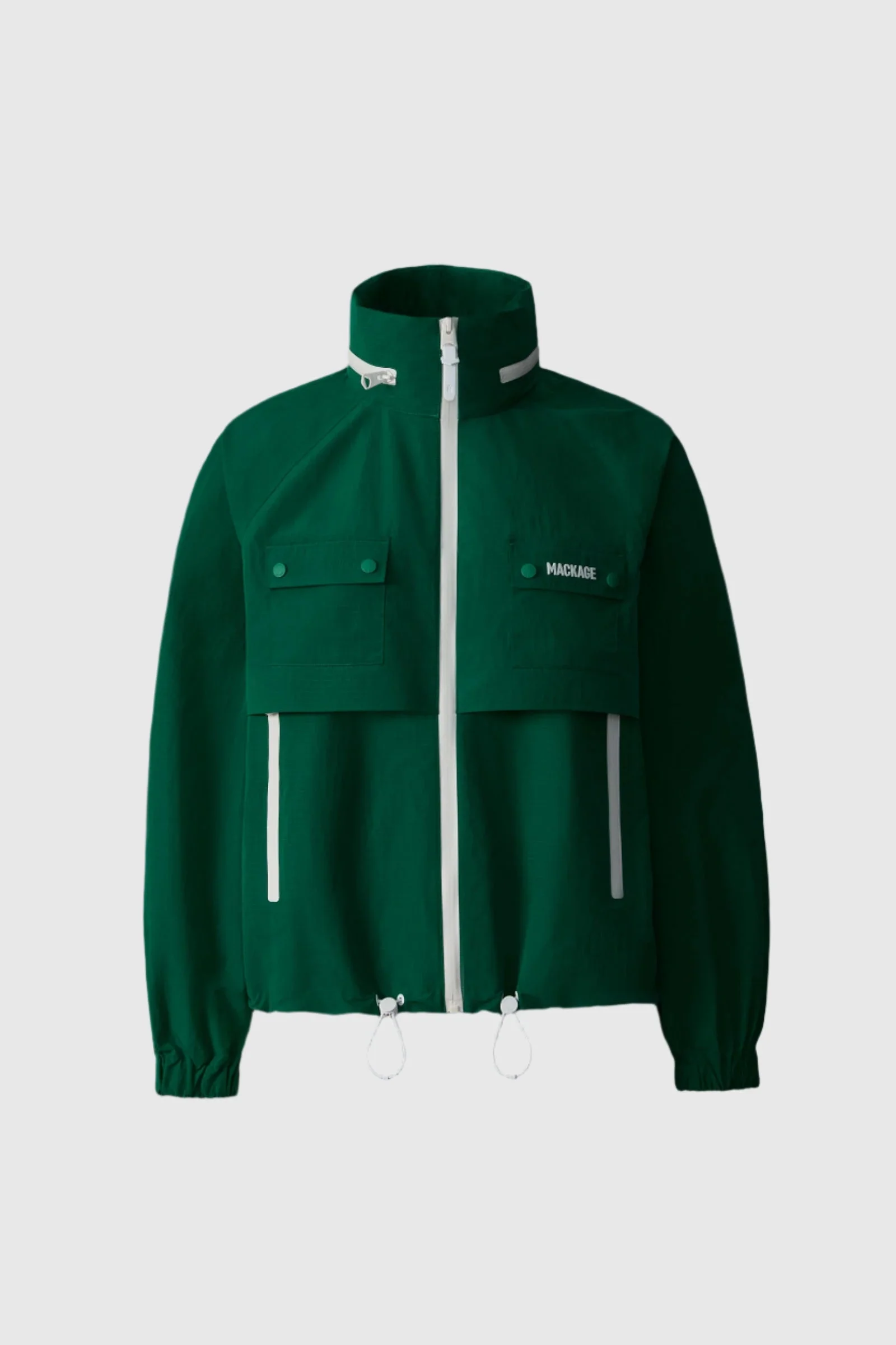 DEVORAH is a lightweight ripstop rain jacket made from recycled materials with seam-sealed construction for windy and rainy days. Water-resistant zippers, hidden hood inside the collar, and rain shedder at front and back provide extra protection for the elements. Adjustable bungee hem for a customizable fit and dual patch pockets at the chest for functionality. Rain or shine, a stylish outerwear piece. DETAILS - Lightweight rain jacket - Stand collar - Seam-sealed construction with water-resistant zippers - Hidden hood inside collar - Dual chest patch pockets with silicone "MACKAGE" branding on flap - Adjustable bungee hem and elastic cuffs - Tonal MACKAGE embroidery detail along placket SIZE & FIT - REGULAR – Classic fit allowing comfort and style. - Designed to be worn with heavier layers. - The model is 5'11" (180 cm) and wears a size S. - Coat length from shoulder to hem: 23 ¾'' / 60 cm. COMPOSITION & CARE - Shell: 75% recycled polyamide, 25% polyamide/ nylon. Lining: 100% polyester. Waterproof, water-repellant & water-resistant. - Dry clean by a leather specialist using only oil-based solvent. Do not use perchloroethylene.