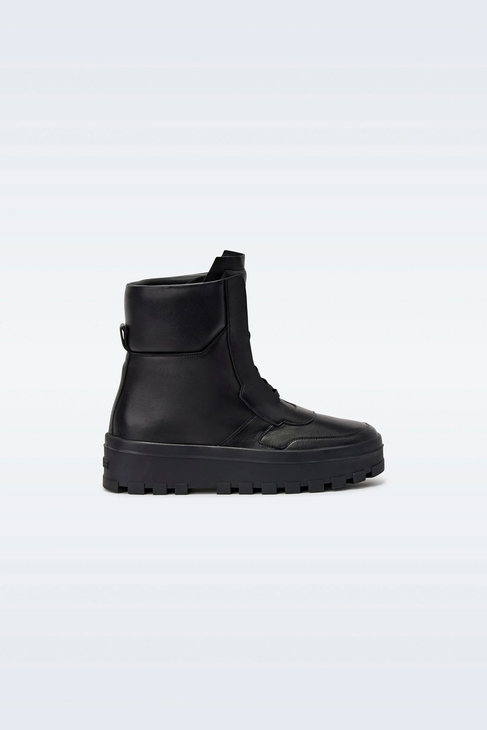 EKON-W is an Italian handcrafted lace-up leather boot for women with signature rubber lug tread sole to ensure traction. Pull-tab for easy entry and discrete signature logo debossed at back heel—a modern boot for the multiseasonal city dweller. DETAILS - Mid-calf lace-up leather boot - Signature logo on back heel - Signature rubber lug tread - Loop tab on back shaft - Handcrafted in Italy - Pull tab for easy grip - Signature M patch - Made in Italy COMPOSITION & CARE - Shell: 100% cow leather. Sole: 100% rubber. Water-repellent & Water-resistant. - Wash gently by hand