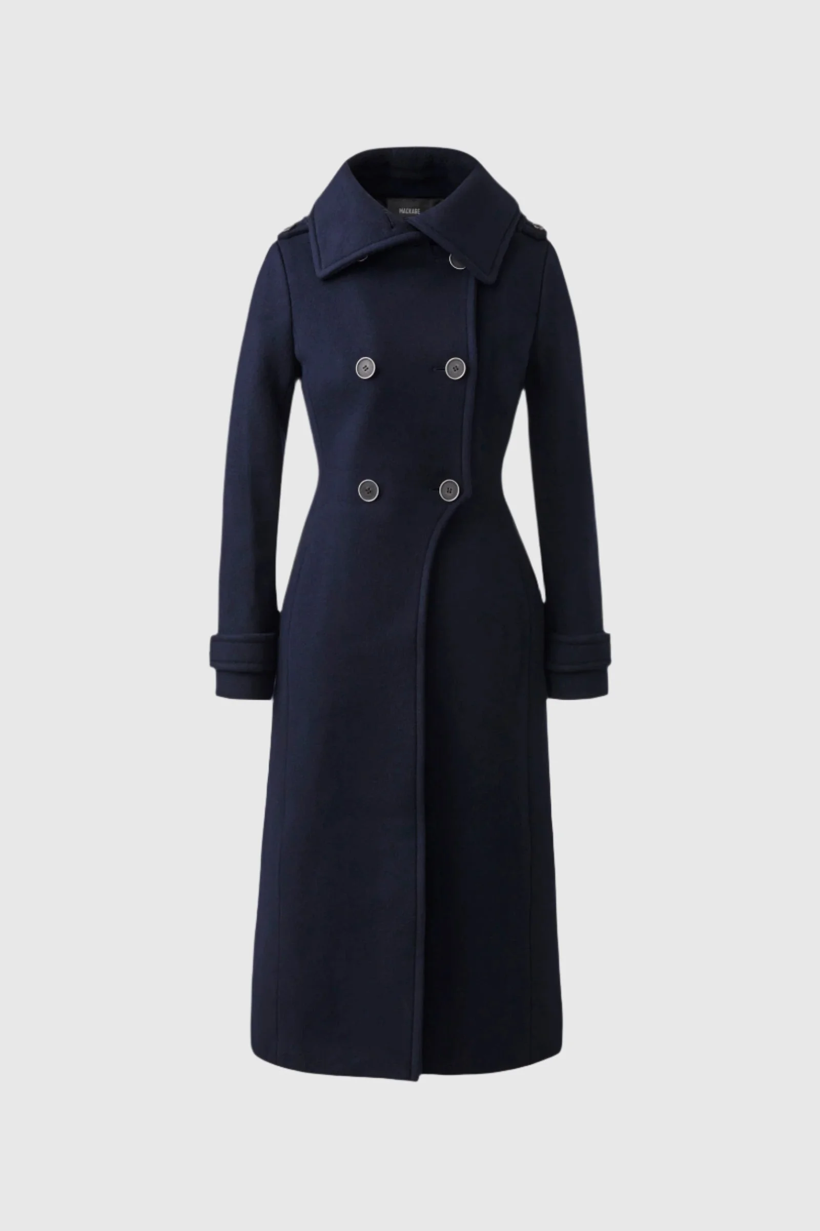 ELODIE is a long tailored coat for women made from soft responsible double-face wool. A handmade fitted silhouette, the double-breasted closure, epaulettes, and cuff tabs enhance its sharp, tailored feel. The structured asymmetrical shirt collar adds protection and unexpected edge. - Long tailored coat - RWS-Certified responsible double-face wool - Handmade - Double-breasted button front closure - Structured asymmetrical shirt collar - Epaulettes with button tabs - Waist pockets with (R) Leather welt - Cuffs with adjustable button tabs - Fitted silhouette SIZE & FIT - FITTED – Our signature fit, closest to the body. - Designed to be worn with light layers, all while keeping you warm. - For heavier layering, we recommend sizing up. - Coat length from shoulder to hem: 45.5'' / 115.57 cm. COMPOSITION & CARE INSTRUCTIONS - Shell : 100% wool. Combo: 100% cow leather. Lining: 100% polyester. - Dry clean by leather specialist using oil based solvent only. Do not use perchloroethylene.