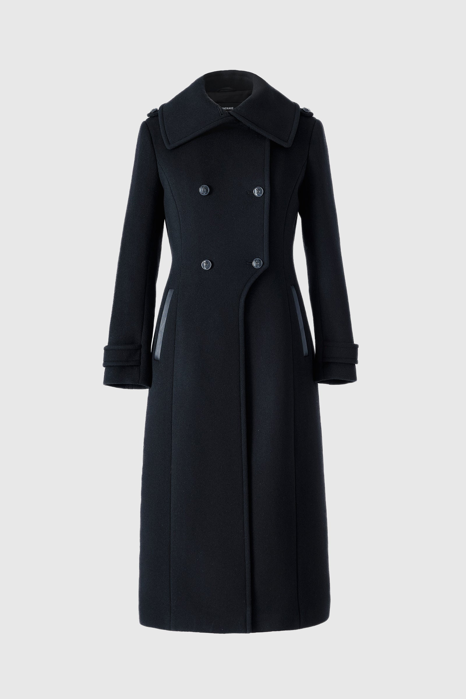 ELODIE-R is a long tailored coat for women made from soft responsible double-face wool. A handmade fitted silhouette, the double-breasted closure, epaulettes, and cuff tabs enhance its sharp, tailored feel. The structured asymmetrical shirt collar adds protection and unexpected edge. DETAILS - Long tailored coat - RWS-Certified responsible double-face wool - Handmade - Double-breasted button front closure - Structured asymmetrical shirt collar - Epaulettes with button tabs - Waist pockets with (R) Leather welt - Cuffs with adjustable button tabs - Fitted silhouette SIZE & FIT - FITTED – Our signature fit, closest to the body. - Designed to be worn with light layers, all while keeping you warm. - For heavier layering, we recommend sizing up. - Coat length from shoulder to hem: 45.5'' / 116 cm. COMPOSITION & CARE - Shell: 100% wool. Combo: 100% cow leather. Lining: 96% polyester, 4% elastane/spandex. - Dry clean by leather specialist using oil based solvent only. Do not use perchloroethylene.