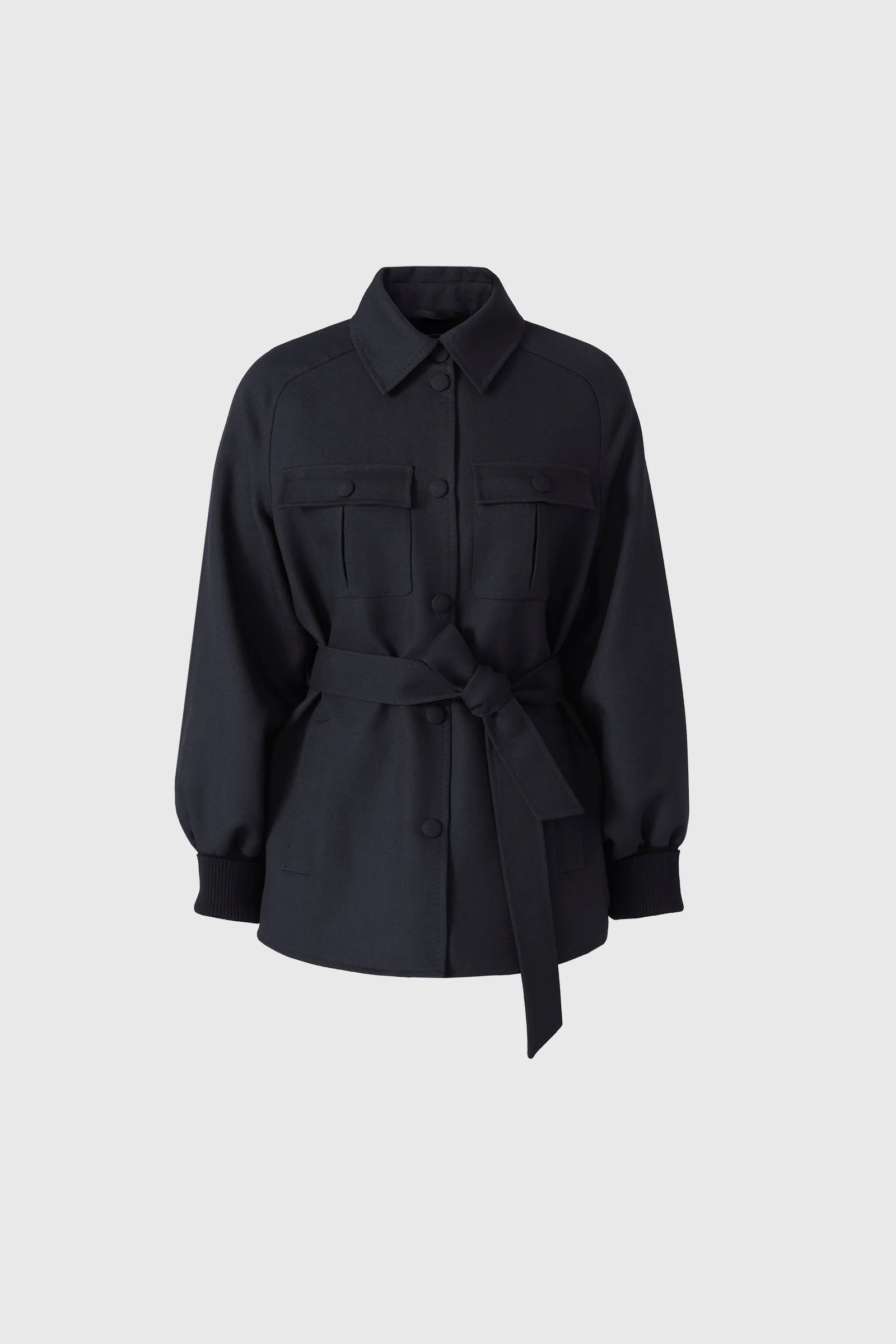 EUGENIA is a medium-length jacket crafted from responsibly-sourced wool gabardine. Tailored with a straight silhouette, it features a shirt collar, patch pockets with flaps and snaps, and welt pockets for functionality. A sash belt cinches the waist, while rib knit cuffs and balloon sleeves lend shape and movement. Fully lined for comfort, it’s a polished outerwear staple with a utilitarian edge. DETAILS - Wool gabardine jacket - Temperature Rating: 5°C - Responsible Wool Standard (RWS) certified - Patch pockets with flaps and snaps - Welt pockets - Sash belt - Shirt collar - Gabardine-covered snaps - High-low hemline - Balloon sleeves with rib knit cuffs - Center front snap closure - Fully lined - Pick stitch detailing throughout - Regular fit - Machine washable SIZE & FIT - SEMI-FITTED – Follows your body’s shape with ease. - Designed to be worn with light layers. - The model is 5'11" (180 cm) and wears a size S. - Coat length from shoulder to hem: 30.75'' / 79 cm. COMPOSITION & CARE - Shell: 100% virgin wool. Lining: 100% viscose - Dry clean by leather specialist using oil based solvent only. Do not use perchloroethylene