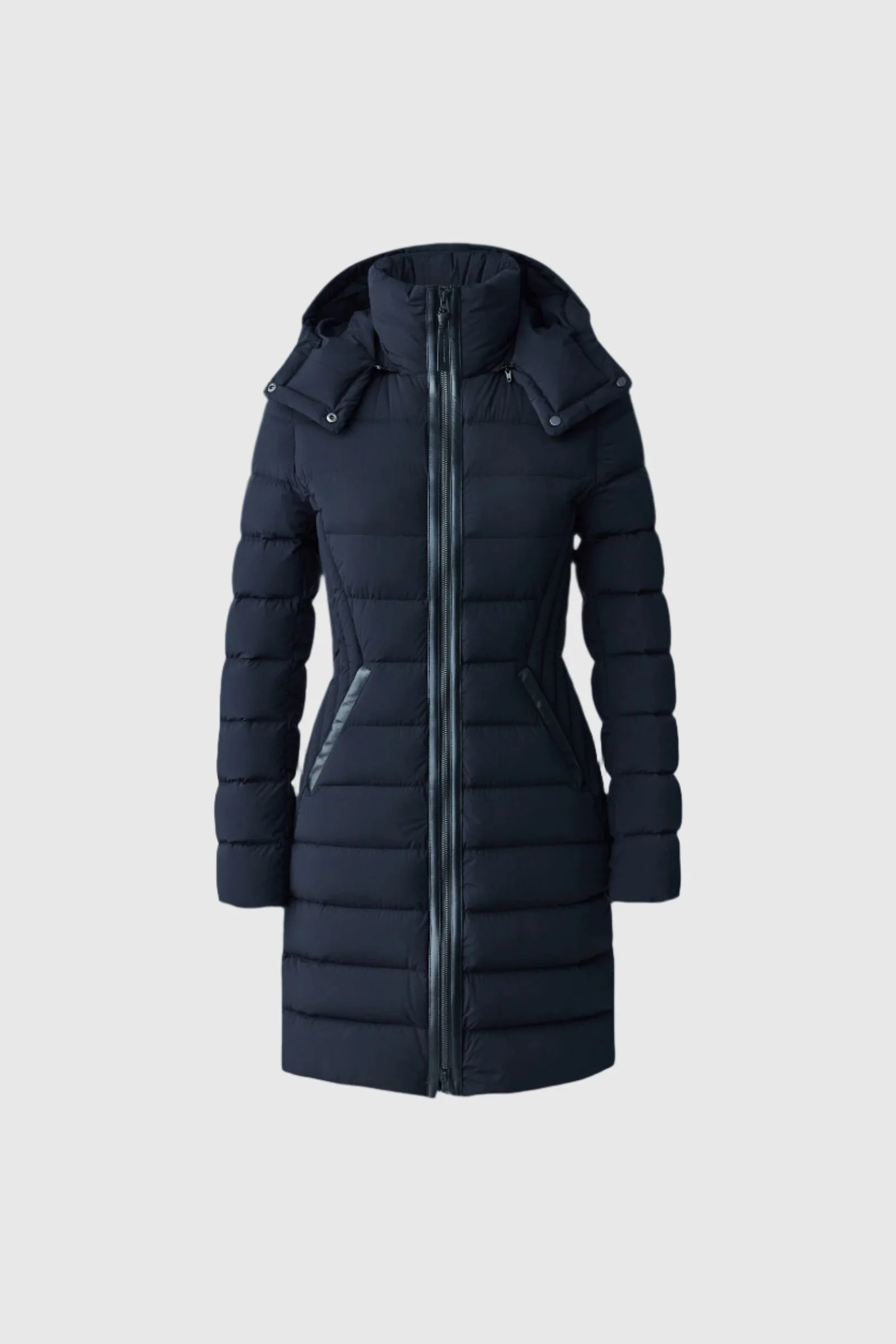 FARREN is a semi-fitted down coat for women made from our proprietary Agile 360 stretch shell. Engineered for protective performance, it is water resistant and repellent—delivering cold protection down to -15°C. Cinch the drawcord storm visor for enhanced protection and warm your hands in the fully lined zippered pockets. A high-performance staple with utilitarian comfort. DETAILS - Longline quilted down coat - Stretch light weight down - Moderate Cold: Down to -15°C - AGILE-360 2-way stretch - Storm visor with drawcord - Removable hood - Center front zipper closure with leather tape - Insulated pockets - Water resistant and repellent - Semi-fitted silhouette SIZE & FIT - SEMI-FITTED – Follows your body’s shape with ease. - Designed to be worn with light layers. - The model is 5'11" (180 cm) and wears a size XS. - Length from shoulder to hem: 34 ½'' / 87 cm. COMPOSITION & CARE - Shell: 82% recycled nylon, 18% elastane/spandex. Lining: 82% recycled nylon, 18% elastane/spandex. Filling: 90% duck down, 10% feathers. Water-repellent & Water-resistant. - Dry clean by leather specialist using oil based solvent only. Do not use perchloroethylene.