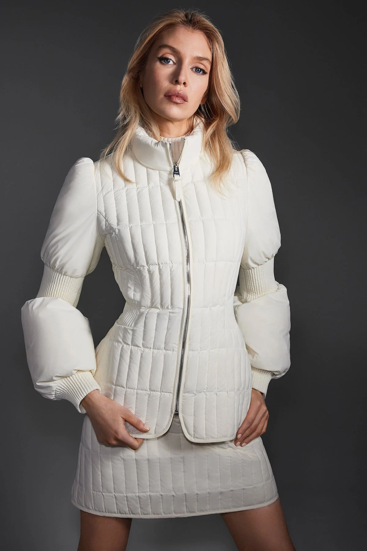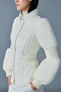 FELICIA is a light-down jacket with a water-repellent and windproof shell. Expertly tailored to a close fit, the vertical quilt and smocking detail create a slimming effect and enable the garment to move with the wearer. Smocked elasticized detail and bell sleeves with tapered cuffs add bespoke detailing. A modern quilted layer with an eye-catching design. DETAILS - Stretch light down jacket - GRS-certified recycled down - Vertical quilting - Center front zipper closure - Smocked elasticized detail - Voluminous sleeves with tapered cuffs - Hidden zipper pockets at side seam - Machine washable - Water-resistant & repellent - Down to -5°C - Fitted SIZE & FIT - FITTED – Our signature fit, closest to the body. - Designed to be worn with light layers, all while keeping you warm. - For heavier layering, we recommend sizing up. - The model is 5'11" (180 cm) and wears a size XS. - Coat length from shoulder to hem: 25'' / 64 cm. COMPOSITION & CARE - Shell: 82% recycled nylon, 18% elastane/spandex. Lining: 82% recycled nylon, 18% elastane/spandex. Filling: 90% duck down, 10% feathers. Combo filling: 100% polyester. Water-repellent and water-resistant. - Close zippers. Remove fur. Remove all removable trims.wash inside out. Wash in domestic machine in water not exceeding 40°C, at normal setting. Use mild detergent. Remove immediately after washing. Do not soak. Tumble dry low heat with tennis balls, until fully dried (1 to 3 hours). Do not wet-clean. Do not bleach. Do not wring. Do not iron or press. Dry clean using oil-based solvent only. Do not use perchloroethylene.