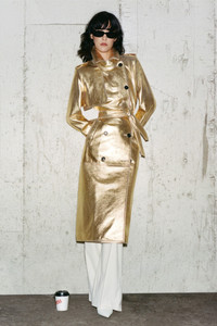 GAEL is a metallic gold double-breasted trench coat for women crafted from our signature (R) Leather with a detachable buttoned throat latch. The wide tailored lapel, button collar latch, and asymmetrical rainshedder create a streamlined look. The long, relaxed silhouette is structured by a (R) Leather sash belt and adjustable buttoned sleeve tabs. Welt waist pockets, epaulette shoulders, and painted edges show elevated tailoring. A timeless piece with standout style, perfect for layering through the year. DETAILS - Fits larger that true size. We recommend one size down from your regular size - Long (R) Leather trench coat in metallic gold - Light: Down to 5°C - Double-breasted button closure - Wide notch lapel - Detachable button collar latch - Rainshedder at right, front, and back - Vent at center back - Adjustable sleeve tabs with buttons - Detachable throat latch with buttons - Sash belt in (R) Leather - Welt waist pockets - Epaulette shoulders - Edge painted detailing - French stitching - Relaxed fit SIZE & FIT - RELAXED – Loose fit for on the go comfort. - Designed to be worn with heavier layers. - The model is wearing a size XS - Coat length from shoulder to hem: 47.5'' / 120.65 cm. COMPOSITION & CARE - Shell: 100% lamb leather. Lining: 100% viscose. - Dry clean with leather specialist only