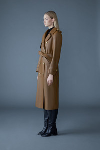 GAEL-V is a double-breasted trench coat crafted from premium-grained leather. The wide notched lapel, button collar latch, and asymmetrical rain shed bring striking lines to the flowing silhouette. The relaxed fit is defined by a removable sash belt and adjustable sleeve tabs while welt waist pockets, epaulettes, and painted edges show subtle yet elevated tailoring. A timeless piece with modern flair, perfect for layering through the season. DETAILS - Maxi leather trench coat - Double-breasted button closure - Wide notched lapel collar - Detachable throat latch with buttons - Left-sided rain shedder - Removable sash belt - Adjustable sleeve tabs with buttons - Welt waist pockets - Vent at center back - Epaulette shoulders - Fully lined - Edge painted detailing - Relaxed fit SIZE & FIT - RELAXED – Loose fit for on the go comfort. - Designed to be worn with heavier layers. - The model is 5'11" (180 cm) and wears a size XS. - Length from shoulder to hem: 47 ½'' / 121 cm. COMPOSITION & CARE - Shell: 100% lamb leather. Lining: 100% viscose. - Dry clean by leather specialist using oil based solvent only. Do not use perchloroethylene.