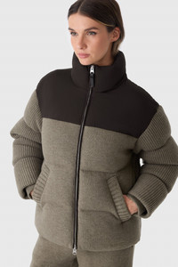 GREER is a down-filled jacket crafted from a soft cashmere-blend yarn with a contrast yoke and hood in stretch recycled nylon. Designed for elevated comfort in extreme cold, it features a removable hood with storm visor, rib knit cuffs, and a stand collar for structured warmth. Contrast knit textures at sleeves and pockets add luxurious texture with functional winter performance. DETAILS - Down-filled jacket - Lightweight stretch recycled nylon - Temperature Rating: -20°C - Crafted with 65% wool, 35% cashmere-blend knit - Contrast yoke and removable hood - Adjustable hood opening with bungee cord and stopper - Stand collar and storm visor - Insulated welt waist pockets - Inner welt pocket with zipper - Contrast knit textures at sleeves and pockets - Rib knit cuffs and underarm eyelets for ventilation - Adjustable bungee hem - Mixed-media construction - MACKAGE embroidery at hem - Fully lined SIZE & FIT - RELAXED – Loose fit for on the go comfort. - Designed to be worn with heavier layers. - The model is 5'11" (180 cm) and wears a size S. - Coat length from shoulder to hem: 25'' / 69 cm. COMPOSITION & CARE - Shell: 65% wool, 35% cashmere. Lining: 82% polyamide/nylon, 18% elastane/spandex. Filling: 90% down, 10% feathers. - Dry clean by leather specialist using oil based solvent only. Do not use perchloroethylene.