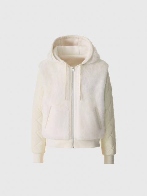GWENDAL is a relaxed-fit reversible hoodie with a reversible design for versatile wear. One side with diamond-quilted sleeves, while the reverse shows a clean fleece finish with a branded chest logo. A full zip closure, rib knit trims, and a kangaroo pocket provide functional comfort, while faux fur and mixed media detailing add standout texture. A signature piece built for warmth and adaptability. DETAILS - Reversible mixed-media hoodie - Center front zipper closure - "MACKAGE" branded drawcord at hood - Kangaroo pocket - Rib knit cuffs and hem - "MACKAGE" silicone branding on chest - "M" logo on left sleeve - Lined with shearling - Inner welt pocket with zipper - Faux fur - Diamond quilting at inner sleeve - Mixed media style - Relaxed fit SIZE & FIT - RELAXED – Loose fit for on the go comfort. - Designed to be worn with heavier layers. - The model is 5'11" (180 cm) and wears a size S. - Coat length from shoulder to hem: 24.5'' / 107 cm. COMPOSITION & CARE - Shell: 53% cotton, 47% polyester.Filling: 100% polyester. - Dry clean by leather specialist using oil based solvent only. Do not use perchloroethylene.