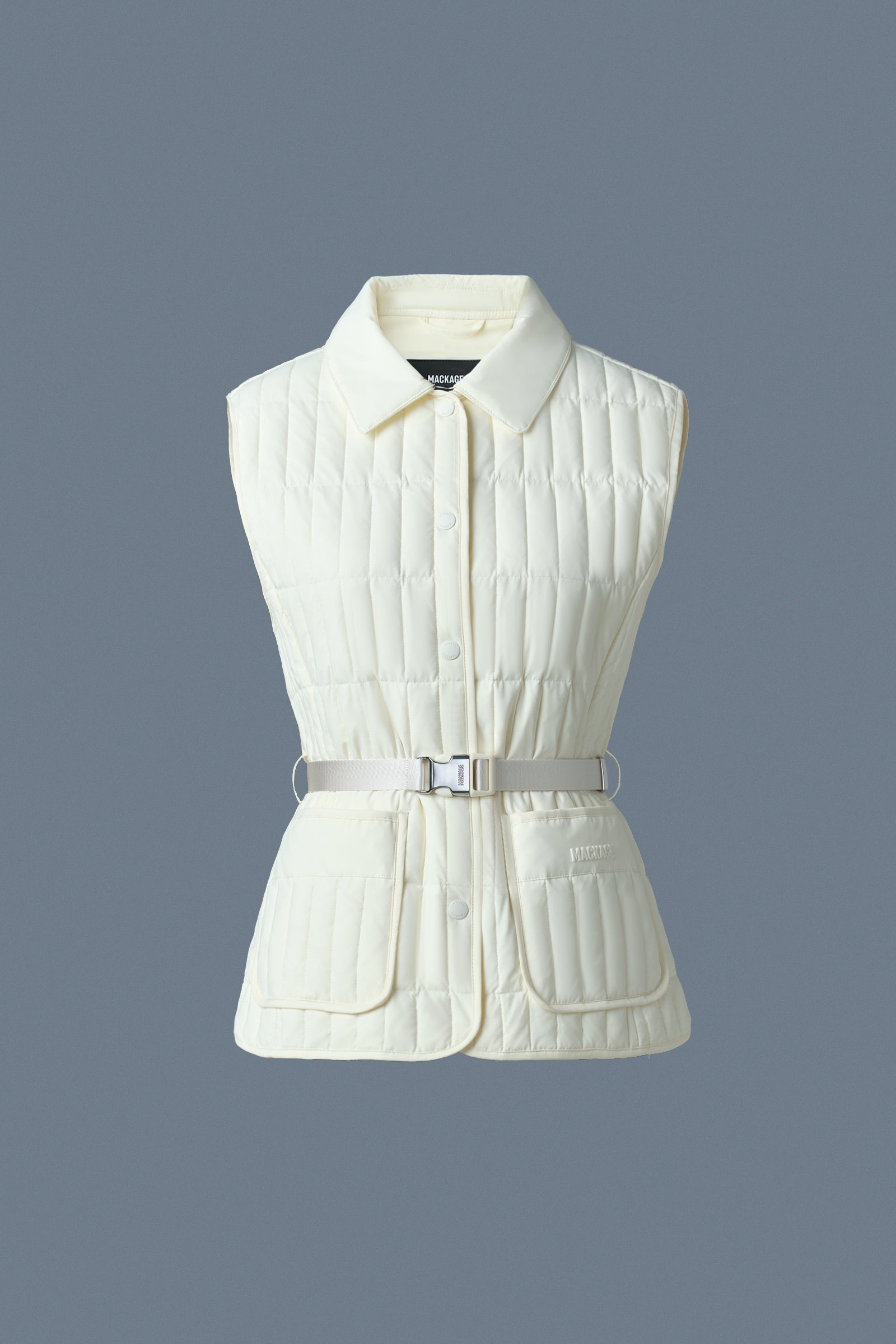 HELIA is a light-down vest with a water-repellent and windproof shell. Perfect for layering, the spread collar, vertical quilting, and snap front closure provide extra protection against the cold. Adjustable belt with buckle adds definition to the semi-fitted silhouette. Waist zip pockets are spacious while a Mackage silicone logo adds signature detailing. Multi-seasonal warmth without burdensome weight. - Light down vest - GRS-certified recycled down - Vertical quilting throughout - Spread collar - Adjustable belt with buckle - High-low hemline - Snap front closure - Patch waist pockets - Signature "MACKAGE" silicone logo at pocket - Machine washable - Water-resistant & repellent - Windproof - Semi-fitted SIZE & FIT - SEMI-FITTED – Follows your body’s shape with ease. - Designed to be worn with light layers. - The model is 5'11" (180 cm) and wears a size XS. - Length from shoulder to hem: 26'' / 66 cm. COMPOSITION & CARE INSTRUCTIONS - Shell: 82% recycled nylon, 18% elastane/spandex. Filling: 90% GRS duck down, 10% feathers. Water-repellent & water-resistant. - Close zippers. Remove fur. Remove the puller. Wash inside out. Wash in domestic machine in water not exceeding 40°C, at normal setting. Use mild detergent. Remove immediately after washing. Do not soak. Tumble dry low heat with tennis balls, until fully dried (1to 3 hours). Do not wet-clean. Do not bleach. Do not wring. Do not iron or press. Dry clean using oil based solvent only. Do not use perchloroethylene.