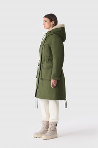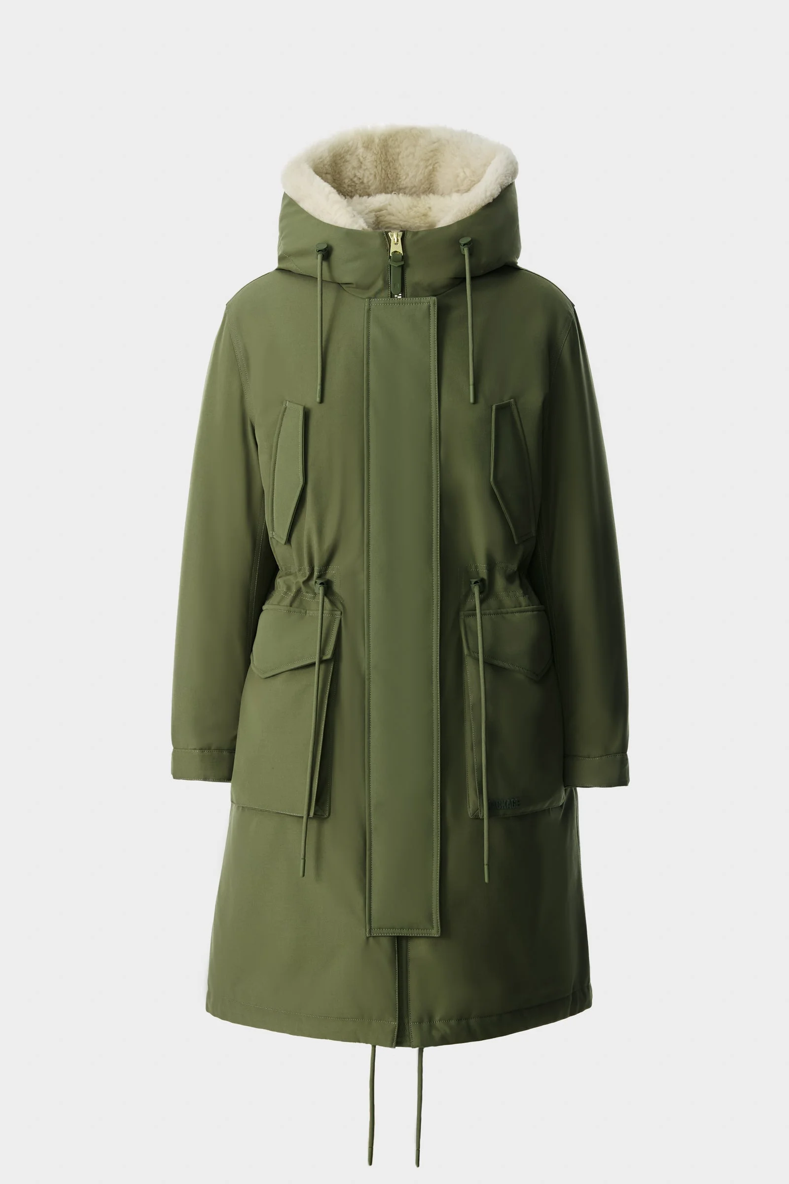 HERA is a 3-in-1 parka with a removable shearling and polyfill liner and down-filled outer shell. It features articulated sleeves and drawcords at the hood, waist, and hem for adaptable coverage. Outer shell is complimented by snap-fastened patch pockets at waist and flap pockets at chest. The removable inner jacket is diamond-quilted, lined in plush shearling and secured with a front zip. Fishtail hem, and tonal logo branding finish the utilitarian design. DETAILS - Long down-filled jacket - Temperature Rating: -25°C - 3-in-1 modular construction - Recycled Twill down parka - Removable polyfill inner liner with shearling body and hood lining - Diamond-quilted liner - Articulated sleeves and rib knit cuffs - 2-way front zip closure at outer and inner layers - Double-entry flap patch pockets at waist - Chest pocket flaps with snap closures - Adjustable hood, waist, and bottom hem - Fishtail vent at back hem - Tonal MACKAGE silicone patch SIZE & FIT - RELAXED – Loose fit for on the go comfort. - Designed to be worn with heavier layers. - The model is 5'11" (180 cm) and wears a size S. - Coat length from shoulder to hem: 41'' / 70 cm. COMPOSITION & CARE - Shell: 70% polyester, 30% rayon. Lining: 100% recycled nylon. Filling: 90% down, 10% feathers. Water-repellent, water-resistant. - Dry clean by leather specialist using oil based solvent only. Do not use perchloroethylene.