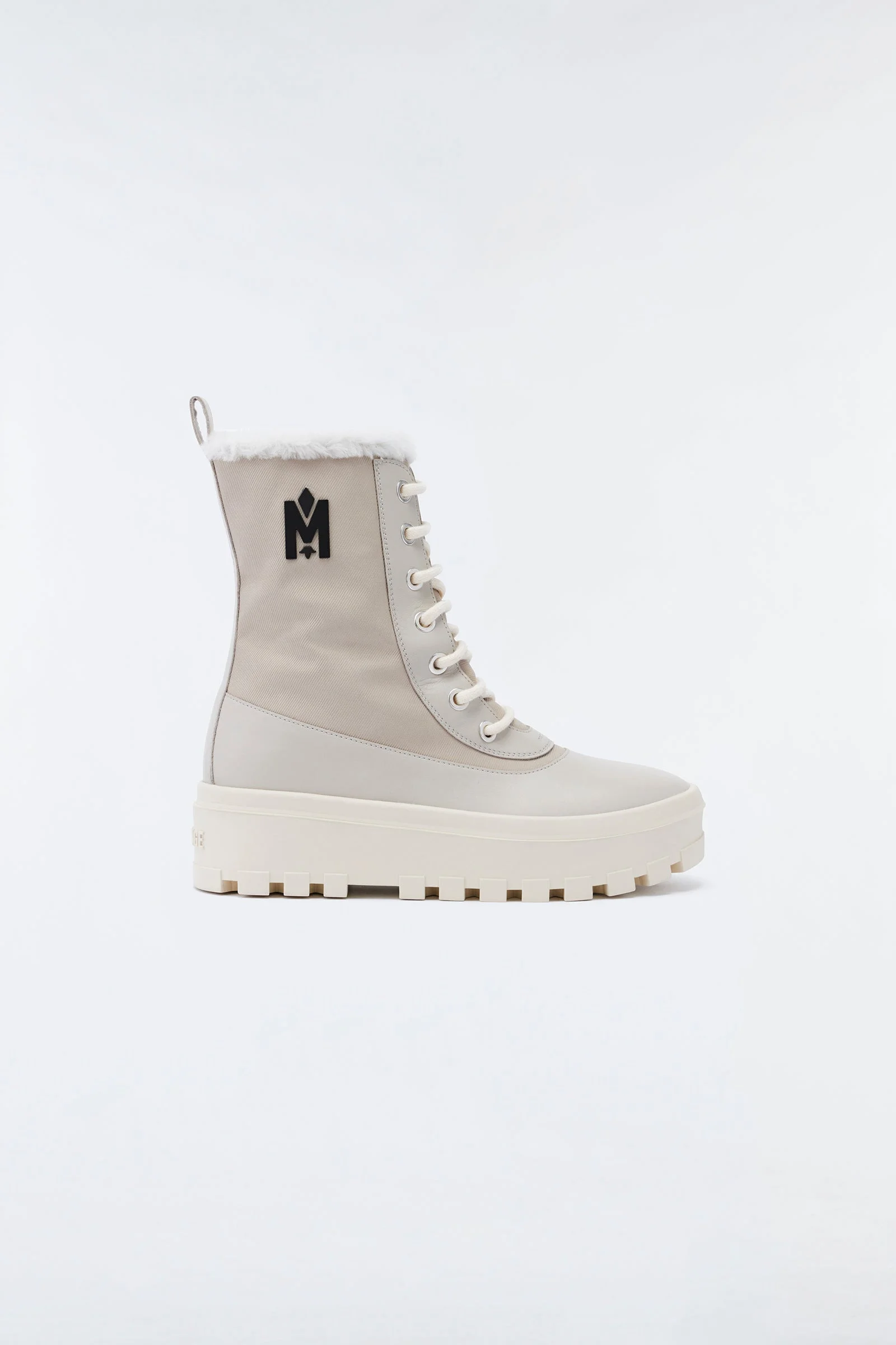 HERO-W is a handcrafted lace-up winter boot for women lined in luxuriously plush shearling for superior warmth. A waterproof membrane and signature rubber lug tread sole ensure traction and protection in the coldest temperatures. A stylish staple boot for winterproof utility. DETAILS - Mid-calf lace-up winter boot - Arctic Rated: Down to -35°C - Shearling-lined - Logo on back heel - Waterproof membrane - Signature rubber lug tread - Loop tab on back shaft - Handcrafted in Italy - Nylon and smooth grain leather shaft with rubber sole - Pull tab for easy grip - Signature M patch - Tested for Canadian winters COMPOSITION & CARE - Shell: 100% polyamide/nylon. Combo: 100% smooth grain leather. Sole: 100% rubber. Lining: 100% shearling. Water-resistant. - Wash gently by hand