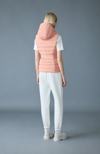 HOSHI is a light down vest crafted from recycled nylon and filled with GRS-certified recycled down. Designed with a streamlined silhouette and quilting, the shell is both water-resistant and warm without weight. Features include a stand collar with a removable hood, offering adaptability across seasons, and an elasticized waist detail for a contoured fit. Fully lined to ensure warmth down to +5°C, this vest is perfect for layering in colder conditions. DETAILS - Light down hooded vest - GRS-certified recycled down - 2-way stretch material - Stand collar with removable hood - Center front zipper closure - Elasticized waist detail - Inner welt pocket with hidden zipper - MACKAGE silicone logo at hem - Temperature rating: +5° SIZE & FIT - SEMI-FITTED – Follows your body’s shape for ease of movement. - Designed tolayer with a fitted top or light sweater. - The model is 5'11" (180 cm) and wears a size S. - Coat length from shoulder to hem: 25'' / 64 cm. COMPOSITION & CARE - Shell: 82% recycled nylon, 18% elastane/spandex. Lining: 100% recycled nylon. Filling: 90% GRS-certified down, 10% feathers. Water repellant & water resistant. - Dry clean by a leather specialist using only oil-based solvent. Do not use perchloroethylene.