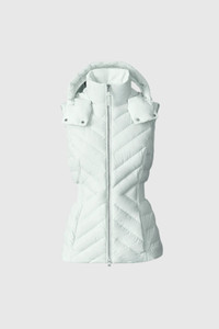 HOSHI is a light down vest crafted from recycled nylon and filled with GRS-certified recycled down. Designed with a streamlined silhouette and quilting, the shell is both water-resistant and warm without weight. Features include a stand collar with a removable hood, offering adaptability across seasons, and an elasticized waist detail for a contoured fit. Fully lined to ensure warmth down to +5°C, this vest is perfect for layering in colder conditions. DETAILS - Light down hooded vest - GRS-certified recycled down - 2-way stretch material - Stand collar with removable hood - Center front zipper closure - Elasticized waist detail - Inner welt pocket with hidden zipper - MACKAGE silicone logo at hem - Temperature rating: +5° SIZE & FIT - SEMI-FITTED – Follows your body’s shape for ease of movement. - Designed tolayer with a fitted top or light sweater. - The model is 5'11" (180 cm) and wears a size S. - Coat length from shoulder to hem: 25'' / 64 cm. COMPOSITION & CARE - Shell: 82% recycled nylon, 18% elastane/spandex. Lining: 100% recycled nylon. Filling: 90% GRS-certified down, 10% feathers. Water repellant & water resistant. - Dry clean by a leather specialist using only oil-based solvent. Do not use perchloroethylene.