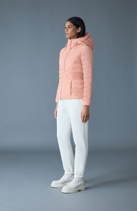 IDALEE is a light down jacket crafted from recycled nylon and filled with GRS-certified recycled down. Designed with a streamlined silhouette and quilting, the shell is water-resistant and waterproof. Features a stand collar and removable hood offering flexibility for varying weather conditions. The smocking detail at waist provides a tailored fit, while the fully lined interior ensures warmth down to -5°C. Perfect for colder days with a sleek, contemporary look. DETAILS - Light down hooded jacket - GRS-certified recycled down - 2-way stretch material - Stand collar with removable hood - Center front zipper closure - Elasticized waist detail - Down-filled insulation - Inner welt pocket with hidden zipper - MACKAGE silicone logo at hem - Temperature rating: -5° SIZE & FIT - SEMI-FITTED – Follows your body’s shape for ease of movement. - Designed to layer with a fitted top or light sweater. - The model is 5'11" (180 cm) and wears a size S. - Coat length from shoulder to hem: 25'' / 64 cm. COMPOSITION & CARE - Shell: 82% recycled nylon, 18% elastane/spandex. Lining : 100% recycled nylon. Filling: 90% GRS-certified down, 10% feathers. Water repellant & water resistant. - Dry clean by a leather specialist using only oil-based solvent. Do not use perchloroethylene.