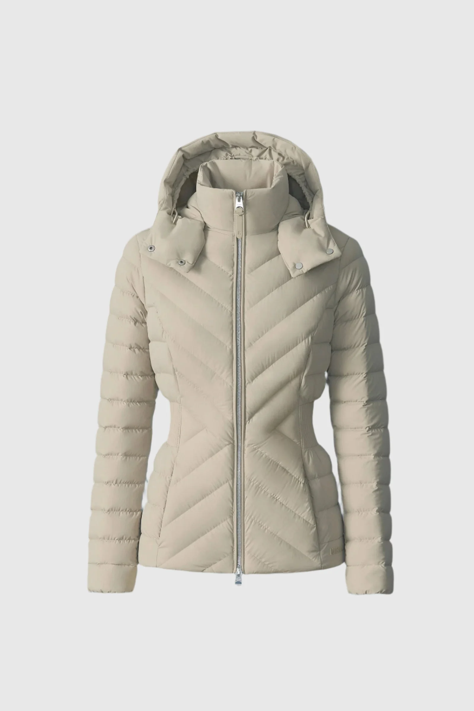 IDALEE is a light down jacket crafted from recycled nylon and filled with GRS-certified recycled down. Designed with a streamlined silhouette and quilting, the shell is water-resistant and waterproof. Features a stand collar and removable hood offering flexibility for varying weather conditions. The smocking detail at waist provides a tailored fit, while the fully lined interior ensures warmth down to -5°C. Perfect for colder days with a sleek, contemporary look. DETAILS - Light down hooded jacket - GRS-certified recycled down - 2-way stretch material - Stand collar with removable hood - Center front zipper closure - Elasticized waist detail - Down-filled insulation - Inner welt pocket with hidden zipper - MACKAGE silicone logo at hem - Temperature rating: -5° SIZE & FIT - SEMI-FITTED – Follows your body’s shape for ease of movement. - Designed to layer with a fitted top or light sweater. - The model is 5'11" (180 cm) and wears a size S. - Coat length from shoulder to hem: 25'' / 64 cm. COMPOSITION & CARE - Shell: 82% recycled nylon, 18% elastane/spandex. Lining : 100% recycled nylon. Filling: 90% GRS-certified down, 10% feathers. Water repellant & water resistant. - Dry clean by a leather specialist using only oil-based solvent. Do not use perchloroethylene.