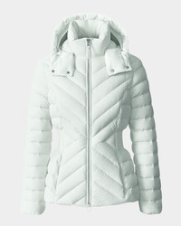 - Warmth without the weight, the "Idalee" jacket by Mackage features down-filled chevron quilting and a defined elasticized waist for shape and comfort. - Water-resistant - Features signature silicone branding on the hem - Stand collar with detachable, drawstring hood - Long sleeves - Side zip pockets - Slim fit - Hip-length - Two-way zip-front - Eclon® nylon/elastane - Fill: GRS-certified recycled down/feather - Lining: Recycled nylon - Dry clean - Imported