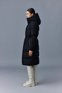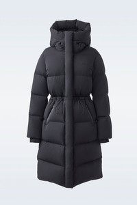 ISHANI-CITY is a recycled light down coat for women made with 2-way Agile-360 stretch technology for ease of movement and enhanced fit. A drawcord waist accentuates the long, relaxed tier-quilt silhouette. Enhanced by an ample hood with a plush pillow collar and adjustable drawcord storm visor. Water-resistant and repellant, lined zip waist pockets and an extra inside pocket brings added utility. An elevated outerwear icon with adaptive warmth and signature performance. - Long light down jacket - 100% recycled down - 800 fill power - Deep Cold: Down to -20°C - Hood with adjustable drawcord storm visor - Centre front zip closure with pillow collar - Hidden snap storm placket - Adjustable drawcord waist for heat retention - Insulated slant zip waist pockets - Inside zip pocket - Logo at chest - Relaxed fit - Fully lined - Agile-360 2-way stretch technology SIZE & FIT - RELAXED – Loose fit for on the go comfort. - Designed to be worn with heavier layers. - The model is 5'11" (180 cm) and wears a size XS. - Length from shoulder to hem: 43'' / 109 cm. COMPOSITION & CARE INSTRUCTIONS - Shell: 82% recycled nylon, 18% elastane/spandex. Combo: 82% polyester, 18% elastane/spandex. Lining: 82% recycled nylon, 18% elastane/spandex. Filling: 90% duck down, 10% feathers. Water-repellent & Water-resistant. - Dry clean by leather specialist using oil-based solvent only. Do not use perchloroethylene.