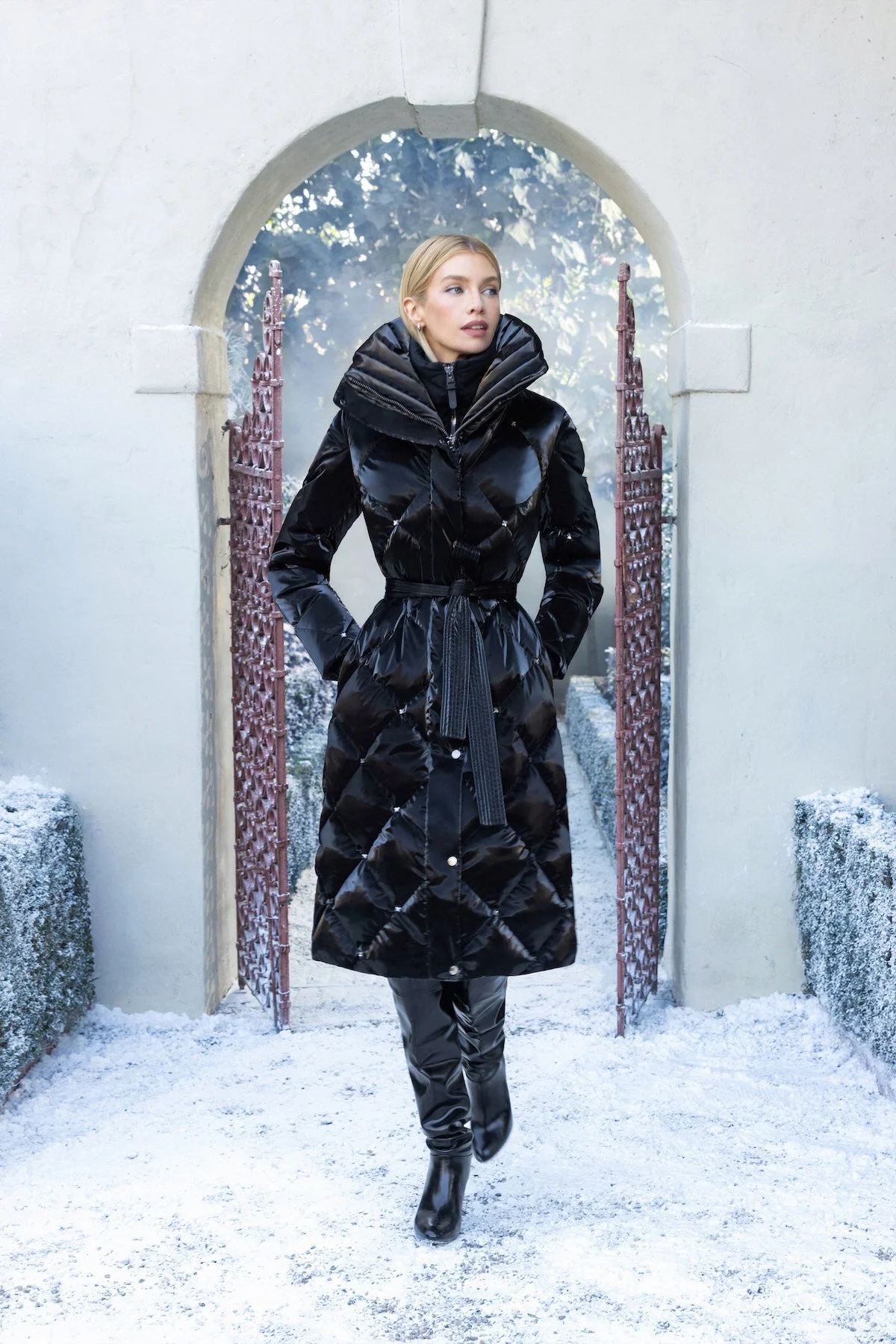 IZUMI-GLO is a high-gloss quilted coat designed to merge statement style with winter-ready warmth. Its exaggerated collar and tonal sash belt create a sculptural silhouette, while a removable down bib adds discreet versatility. Bejeweled with rhinestone detailing throughout—luxury design meets functional winter layering. DETAILS - High-gloss quilted long coat - GRS-certified recycled down - Temperature Rating: -15°C - 2-in-1 construction with removable lightweight down bib - Diamond-quilted high-gloss shell - Sash belt with tonal stitching - Wide collar - Insulated interior and inside pocket - Side seam pocket and rib knit cuffs - Embroidered eyelets for ventilation - "M" logo on left sleeve - Rhinestone detailing SIZE & FIT - SEMI-FITTED – Follows your body’s shape with ease. - Designed to be worn with light layers. - The model is 5'11" (180 cm) and wears a size S. - Coat length from shoulder to hem: 42.5'' / 66 cm. COMPOSITION & CARE - Shell: 100% polyurethane. Lining: 82% recycled nylon, 18% elastane/spandex. Filling: 85% recycled down, 15% recycled feathers. Water-repellent, water-resistant. - Close zippers. Remove fur. Remove all removable trims. Wash in domestic machine in water not exceeding 30°C at delicate gentle setting. Wash inside out. Use mild detergent. Remove immediately after washing. Do not soak. Tumble dry at low heat with tennis balls until fully dried (1 to 3 hours). Do not wet-clean. Do not bleach. Do not wring. Do not iron or press. Do not steam. Do not dry clean.