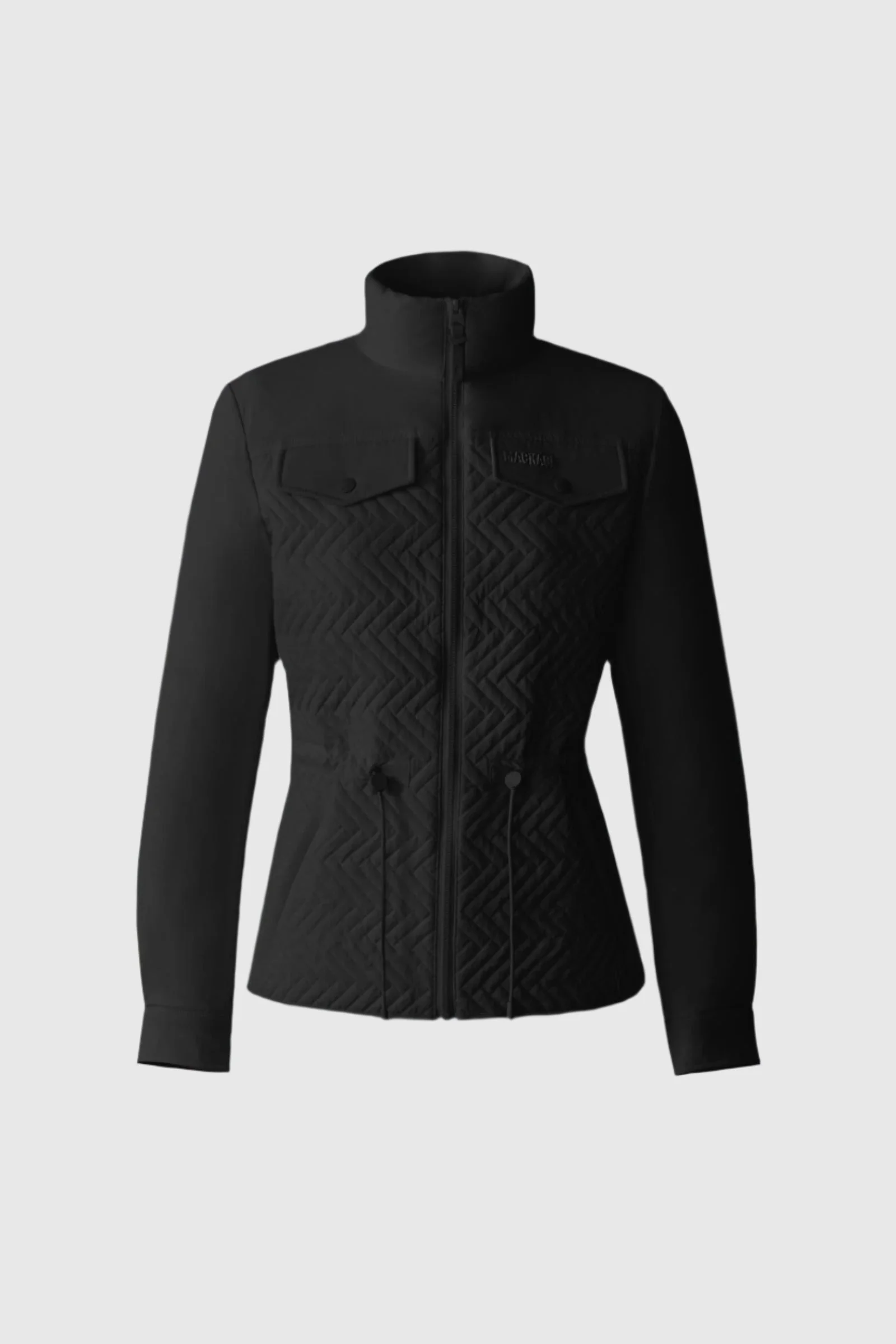 KABIRA is a semi-fitted down jacket made from water-resistant and lightweight recycled materials. Unlined and washable, it features a chevron quilted body, stand collar, and zippered welt pockets. Adjustable elements at the waist and cuffs provide a customizable fit, while the flap chest pockets and subtle branding add utility and style. Perfect for brisk mornings on its own or layered for colder days. DETAILS - Chervon quilted lightweight down jacket - Made from sustainable materials - Quilted body (outer layer) - Unlined and washable - Adjustable drawcord at waist - Adjustable sleeve cuff with snap - Stand collar - Zippered welt pockets at waist - Chest pocket flaps with snaps - MACKAGE silicone logo on pocket flap - Semi-fitted silhouette - Water resistant - Temperature rating: -5°C - Machine washable - Unlined SIZE & FIT - SEMI-FITTED – Follows your body’s shape with ease. - Designed to be worn with light layers. - The model is 5'11" (180 cm) and wears a size S. - Coat length from shoulder to hem: 24.75'' / 79 cm. COMPOSITION & CARE - Shell: 82% recycled nylon, 18% elastane/spandex. Filling: 90% recycled down, 10% recycled feathers. Water-repellent, water-resistant. - Close zippers. Remove fur. Remove all removable trims. Wash inside out. Wash in domestic machine in water not exceeding 40°c, at normal setting. Use mild detergent. remove immediately after washing. Do not soak. Tumble dry low heat with tennis balls, until fully dried (1to 3 hours). Do not wet-clean. Do not bleach. Do not wring. Do not iron or press. Dry clean using oil based solvent only. Do not use perchloroethylene.