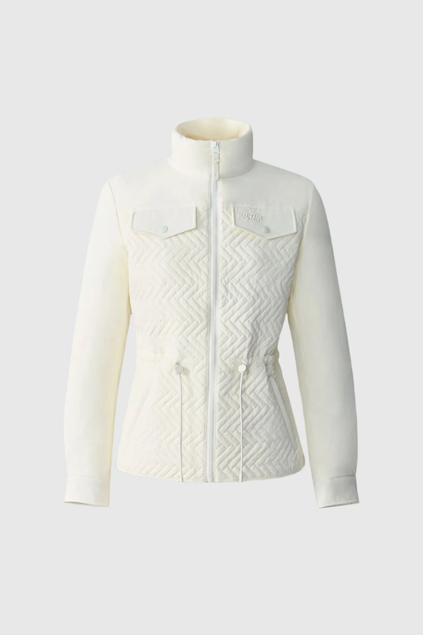 KABIRA is a semi-fitted down jacket made from water-resistant and lightweight recycled materials. Unlined and washable, it features a chevron quilted body, stand collar, and zippered welt pockets. Adjustable elements at the waist and cuffs provide a customizable fit, while the flap chest pockets and subtle branding add utility and style. Perfect for brisk mornings on its own or layered for colder days. DETAILS - Chervon quilted lightweight down jacket - Made from sustainable materials - Quilted body (outer layer) - Unlined and washable - Adjustable drawcord at waist - Adjustable sleeve cuff with snap - Stand collar - Zippered welt pockets at waist - Chest pocket flaps with snaps - MACKAGE silicone logo on pocket flap - Semi-fitted silhouette - Water resistant - Temperature rating: -5°C - Machine washable - Unlined SIZE & FIT - SEMI-FITTED – Follows your body’s shape with ease. - Designed to be worn with light layers. - The model is 5'11" (180 cm) and wears a size S. - Coat length from shoulder to hem: 24.75'' / 79 cm. COMPOSITION & CARE - Shell: 82% recycled nylon, 18% elastane/spandex. Filling: 90% recycled down, 10% recycled feathers. Water-repellent, water-resistant. - Close zippers. Remove fur. Remove all removable trims. Wash inside out. Wash in domestic machine in water not exceeding 40°c, at normal setting. Use mild detergent. remove immediately after washing. Do not soak. Tumble dry low heat with tennis balls, until fully dried (1to 3 hours). Do not wet-clean. Do not bleach. Do not wring. Do not iron or press. Dry clean using oil based solvent only. Do not use perchloroethylene.