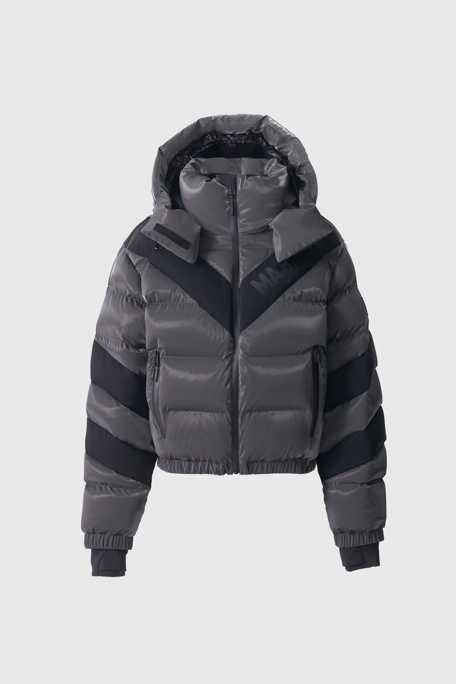 KAIRI-GLO is a recycled down ski jacket crafted from a high-gloss shell with chevron striping. Removable hood, powder skirt, and elasticized cuffs offer adaptive features for cold mornings and warmer afternoons. Water-resistant zippers and storm-ready features provide high-performance protection. Technical function meets standout shine. DETAILS - Recycled down ski jacket - High-gloss shell with chevron stripes - Temperature Rating: -15°C - Water-resistant, repellent, and windproof - Detachable hood and snow skirt - Water-resistant zip front and insulated pockets - Storm cuffs with thumb loops - Elasticized cuffs and hem - Hidden zipper at sleeve - Branded storm placket - Oversized fit - Machine washable SIZE & FIT - OVERSIZED – Casual and cool fit for layering. - Designed to be worn with heavy layers or alone for an edgy look. - For a more fitted look or for petite customers, we recommend to size down. - The model is 5'11" (180 cm) and wears a size S. - Coat length from shoulder to hem: 23'' / 64 cm. COMPOSITION & CARE - Shell: 100% polyurethane. Lining: 100% recycled nylon. Filling: 90% down, 10% feathers. Water-repellent, water-resistant. - Close zippers. Remove fur. Remove all removable trims. Wash in domestic machine in water not exceeding 30°C at delicate gentle setting. Wash inside out. Use mild detergent. Remove immediately after washing. Do not soak. Tumble dry at low heat with tennis balls until fully dried (1 to 3 hours). Do not wet-clean. Do not bleach. Do not wring. Do not iron or press. Do not steam. Do not dry clean.