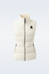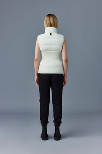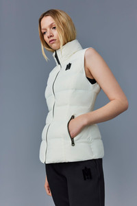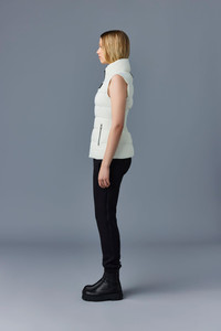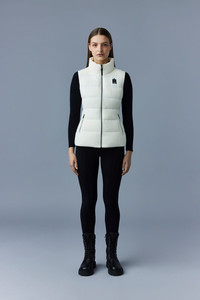 GISELA is a sustainable light down vest with stand collar. Tailored to a fitted silhouette, the channel quilt shell boasts subtle stretch for ease of movement. Flawless panel construction and an elastic waist back insert enhance the cinched look. A sleek mid-season staple for effortless layering. - Ultra light down vest - Sustainable down - 2-way stretch shell - Channel quilting - Low stand collar - Centre front zip closure - Elastic waist back insert - Zip waist pockets - Inside pocket - Signature M logo patch on left chest - Signature closest-to-the-body fit SIZE & FIT - FITTED – Our signature fit, closest to the body. - Designed to be worn with light layers, all while keeping you warm. - For heavier layering, we recommend sizing up. - Model is 5'11" / 180 cm and wears a size XS COMPOSITION & CARE INSTRUCTIONS - Shell (woven. In-visible): 82% polyamide/nylon, 18% elastane/spandex. Filling (down): 90% chinese pure white goose down. 10% chinese goose feathers. Treatment: Water-resistant & water-repellent. - Dry clean by leather specialist using oil based solvent only. Do not use perchloroethylene.