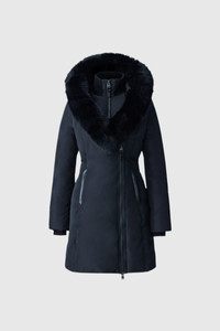 KAY-BX is a three-quarter fitted down coat for women featuring a Signature Collar with blue fox fur and an asymmetrical zip closure. Made from recycled down, it features an inner bib with rib collar, hidden hood toggle, and storm cuffs. Water resistant, repellant, and windproof, insulated leather welt pockets add warmth and function. A design-forward winter essential elevated with directional tailoring. DETAILS - Three-quarter fitted down coat - Recycled down - 800 fill power - Signature Collar with blue fox fur - Deep Cold: Down to -25°C - Asymmetrical zip front closure - Hidden hood toggle for adaptable coverage - Inner bib with ribbed collar - Ribbed storm cuffs - Leather welt zip pockets - Fleece pocket lining for extra warmth - Inside zip pocket - Fitted silhouette SIZE & FIT - FITTED – Our signature fit, closest to the body. - Designed to be worn with light layers, all while keeping you warm. - For heavier layering, we recommend sizing up. - Coat length from shoulder to hem: 36'' / 91.44 cm. COMPOSITION & CARE - Shell : 100% polyester. Combo 100% cow leather. Lining: 100% polyester. Filling: 90% duck down, 10% feathers. Fur: 100% finland blue fox. Water-repellent & water-resistant. - Dry clean by leather specialist using oil based solvent only. Do not use perchloroethylene.