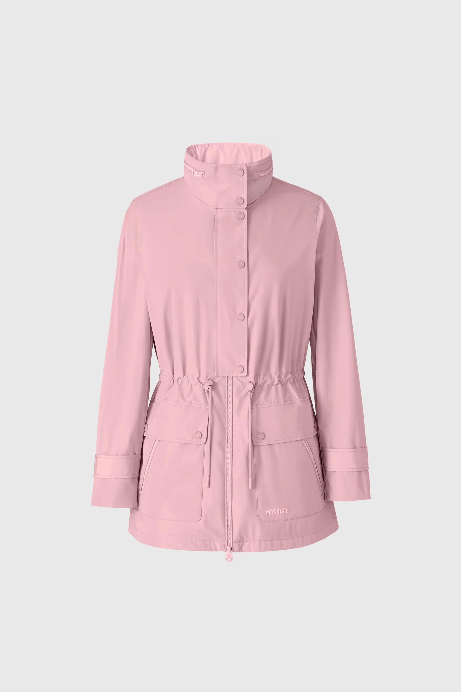 KERYN-Z is a sustainable, medium-length jacket crafted from 100% recycled polyester. Featuring a relaxed silhouette with functional details, this jacket includes a stand collar with a packable hood and double-entry patch pockets, making it ideal for urban and outdoor wear. Designed with adjustable elements for a personalized fit, this piece combines versatility with a modern aesthetic. Lined with incredilby warm jersey for colder days. An adaptable and stylish layer for a range of conditions. DETAILS - Medium-length rain jacket - 100% recycled polyester - Center front zipper closure - Double entry patch pocket at waist with flap and snap - Inner welt pocket with zipper - Adjustable drawcord at waist - Adjustable sleeve cuff with snap - MACKAGE silicone branding at pocket - Stand collar with packable hood - Rain shedder at back - Body lined with jersey SIZE & FIT - RELAXED – Loose fit for on the go comfort. - Designed to be worn with heavier layers. - The model is 5'11" (180 cm) and wears a size S. - Coat length from shoulder to hem: 29 ¼'' / 75 cm. COMPOSITION & CARE - Shell: 100% recycled polyester. Lining: 100% polyester. Water repellant & water resistant. - Dry clean by a leather specialist using only oil-based solvent. Do not use perchloroethylene.