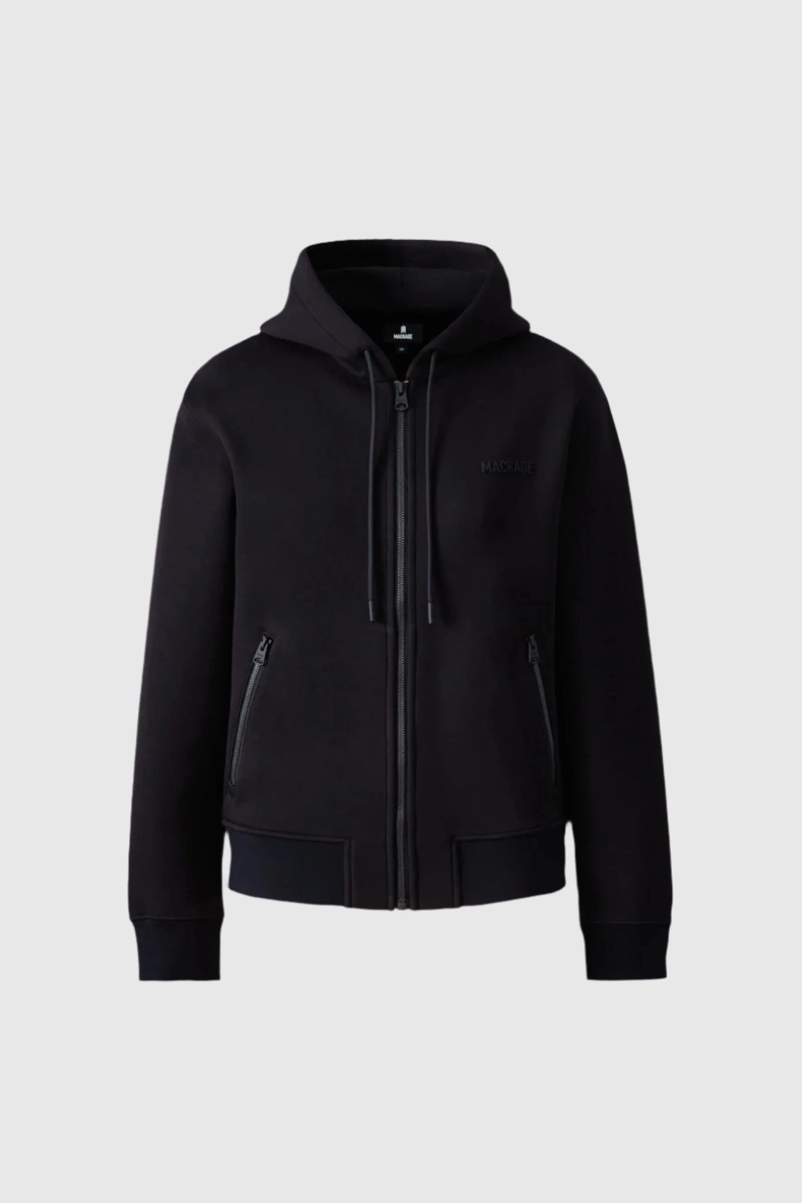 KRYSSA is a zip-up hoodie made from double-face jersey. The rib knit cuffs and hem provide an enhanced fit for better warmth and comfort, while the hood's drawcord offers adjustable coverage. Zippered waist pockets secure your essentials, and the "MACKAGE" logo at chest adds subtle brand flair. Partially lined with a sleek design for essential everyday functionality. DETAILS - Double-face hoodie with front zipper - Rib knit cuffs and hem - Adjustable drawcord hood - Centre front zipper closure - Waist pockets with zippers - Signature "MACKAGE" silicone logo at chest - Partially lined - Machine washable SIZE & FIT - RELAXED – Loose fit for on the go comfort. - Designed to be worn with heavier layers. - The model is 5'11" (180 cm) and wears a size S. - Length from shoulder to hem: 23'' / 58 cm. COMPOSITION & CARE - Shell: 53% cotton, 47% polyester. Combo: 72% polyamide/ nylon, 27% polyester, 1% elastane/spandex. Lining: 100% cotton. - Wash in domestic or commercial machine in water not exceeding 30°C at normal setting. Wash inside out. Use mild detergent. Wash with similar colors. Remove immediately after washing. Do not tumble dry. Iron with or without steam by hand, or press on commercial equipment, at low temperature (not exceeding 110°C). Do not bleach. Dry clean using oil-based solvent only. Do not use perchloroethylene.