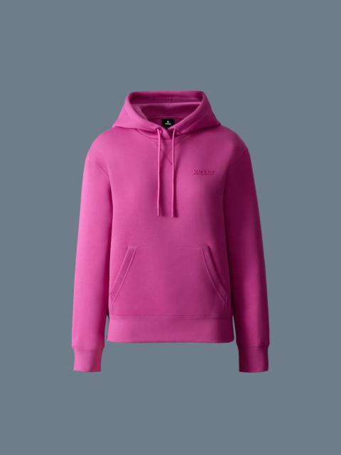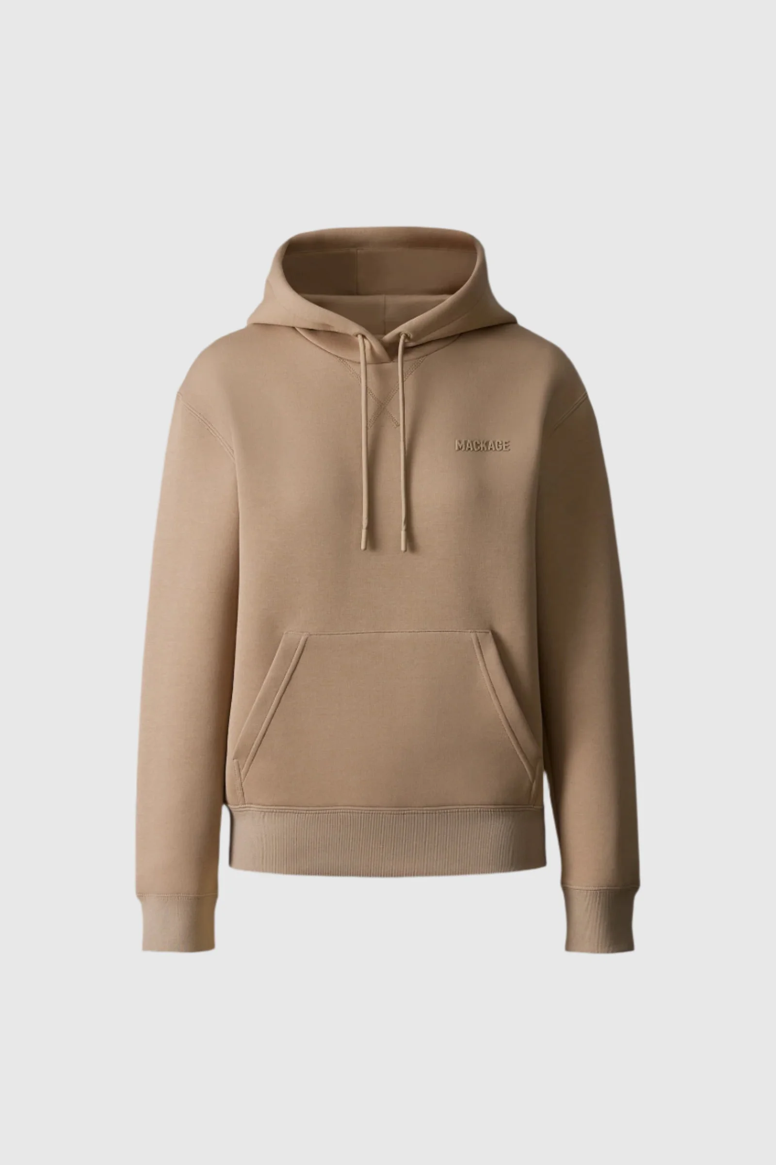 KRYSTIANA is a classic hoodie crafted to a relaxed fit from ultra soft double-face jersey. The kangaroo pocket and rib knit trims add timeless detail. A luxe loungewear essential for elevated streetstyle. DETAILS - Double-face hoodie - Drop shoulder cut - Kangaroo pocket - Adjustable drawcord hood - Signature "MACKAGE" silicone logo at chest - V-insert at neckline - Rib knit cuffs and hem - Partially lined - Machine washable - Relaxed fit SIZE & FIT - RELAXED – Loose fit for on the go comfort. - Designed to be worn with heavier layers. - The model is 5'11" (180 cm) and wears a size S. - Length from shoulder to hem: 24 ¼'' / 62 cm. COMPOSITION & CARE - Shell: 53% cotton, 47% polyester. Combo: 72% polyamide/ nylon, 27% polyester, 1% elastane/spandex. Lining: 100% cotton. - Wash in domestic or commercial machine in water not exceeding 30°C at normal setting. Wash inside out. Use mild detergent. Wash with similar colors. Remove immediately after washing. Do not tumble dry. Iron with or without steam by hand, or press on commercial equipment, at low temperature (not exceeding 110°C). Do not bleach. Dry clean using oil-based solvent only. Do not use perchloroethylene.