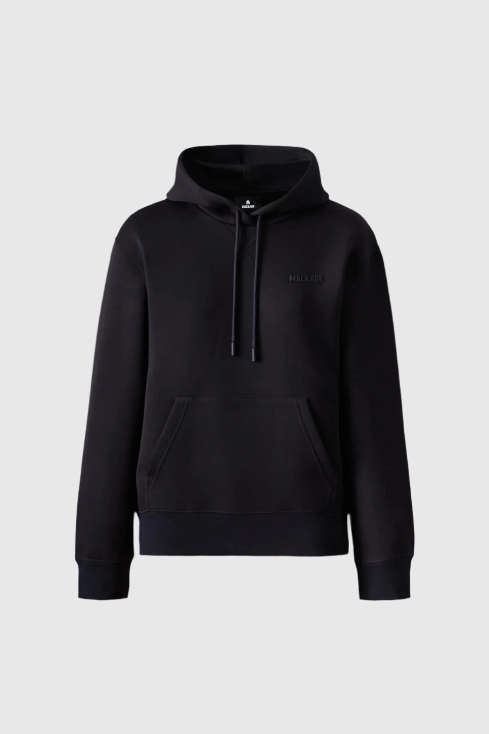 KRYSTIANA is a classic hoodie crafted to a relaxed fit from ultra soft double-face jersey. The kangaroo pocket and rib knit trims add timeless detail. A luxe loungewear essential for elevated streetstyle. DETAILS - Double-face hoodie - Drop shoulder cut - Kangaroo pocket - Adjustable drawcord hood - Signature "MACKAGE" silicone logo at chest - V-insert at neckline - Rib knit cuffs and hem - Partially lined - Machine washable - Relaxed fit SIZE & FIT - RELAXED – Loose fit for on the go comfort. - Designed to be worn with heavier layers. - The model is 5'11" (180 cm) and wears a size S. - Length from shoulder to hem: 24 ¼'' / 62 cm. COMPOSITION & CARE - Shell: 53% cotton, 47% polyester. Combo: 72% polyamide/ nylon, 27% polyester, 1% elastane/spandex. Lining: 100% cotton. - Wash in domestic or commercial machine in water not exceeding 30°C at normal setting. Wash inside out. Use mild detergent. Wash with similar colors. Remove immediately after washing. Do not tumble dry. Iron with or without steam by hand, or press on commercial equipment, at low temperature (not exceeding 110°C). Do not bleach. Dry clean using oil-based solvent only. Do not use perchloroethylene.