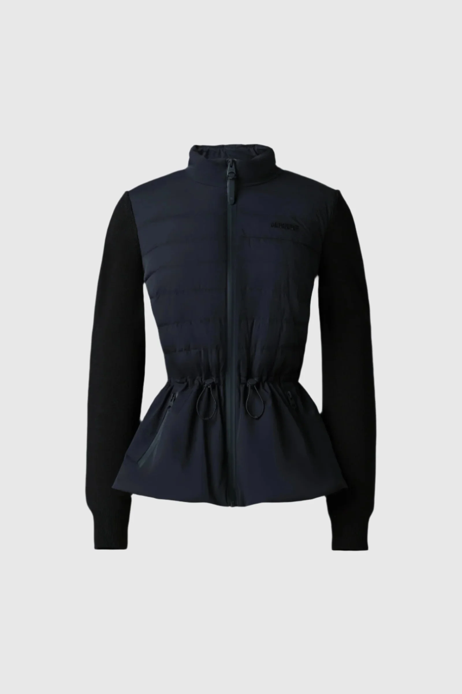 LAIKA-Z is a mixed-media jacket featuring a peplum and recycled quilted light down front. An expertly tailored indoor-outdoor style with soft knit detailing at sleeves and back panel. Perfect for every day, the drawcord waist lends a custom fit and cinched silhouette. DETAILS - Mixed-media jacket - Matted stretch light down front - 800+ traceable RDS certified duck down - GRS-certified recycled down - Knit sleeves and back panel - Peplum detail at waist - Centre front zip front closure - Adjustable bungee at waist - Zip waist pockets - Signature "MACKAGE" silicone logo at chest - Machine washable - Semi-fitted SIZE & FIT - SEMI-FITTED – Follows your body’s shape with ease. - Designed to be worn with light layers. - Female model is 5'11" (180 cm) and wears a size XS. - Length from shoulder to hem: 24'' / 61 cm. COMPOSITION & CARE - Shell: 82% recycled nylon, 18% elastane/spandex. Combo Shell 1: 42% wool, 42% acrylic, 14% polyester, 2% elastane/spandex. Lining: 82% recycled nylon, 18% elastane/spandex. Filling: 90% GRS goose down, 10% feathers. - Dry clean by leather specialist using oil based solvent only. Do not use perchloroethylene.