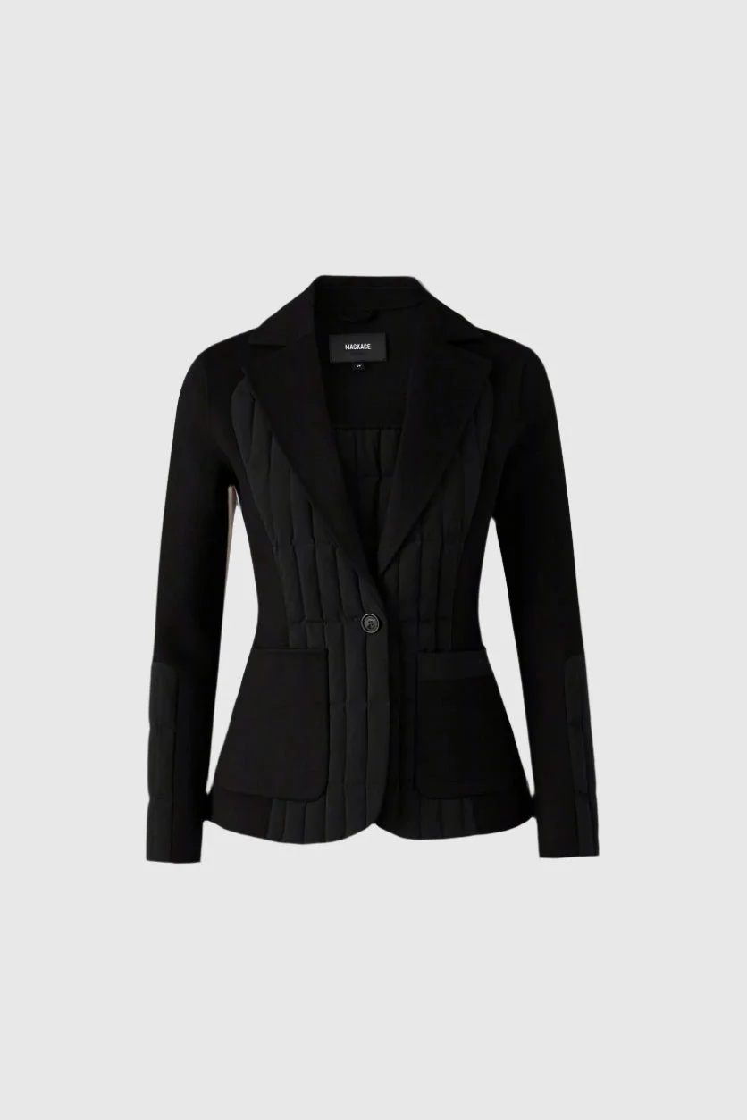 LEILANI is a tailored jacket crafted from double-face wool and filled with GRS certified recycled down. The slim silhouette is defined by vertical quilting throughout, complemented by buttons and a tailored collar. It features patch pockets, an sleeve cuff tab with buttons, and an elasticized back waist detail for added comfort. The vent at the center back allows for greater movement, and the jacket is partially lined for extra warmth. Lightweight protection against the elements with modern style. DETAILS - Classic tailored wool jacket - Temperature rating: 0°C - GRS certified recycled down filling - Tailored collar with buttons - Vertical quilted detailing throughout - Patch pockets with "MACKAGE" silicone branding - Sleeve cuff tab with buttons - Elasticized back waist detail - Vent at center back - Partially lined SIZE & FIT - FITTED – Our signature fit, closest to the body. - Designed to be worn with light layers, all while keeping you warm. For heavier layering, we recommend sizing up. - The model is 5'11" (180 cm) and wears a size S. - Coat length from shoulder to hem: 25'' / 64 cm. COMPOSITION & CARE - Shell: 100% wool. Combo shell 1: 82% recycled nylon, 18% elastane/spandex. Filling: 90% GRS-certified down, 10% feathers. Water repellant. - Dry clean by a leather specialist using only oil-based solvent. Do not use perchloroethylene.