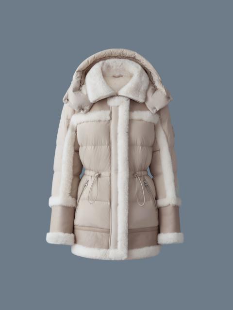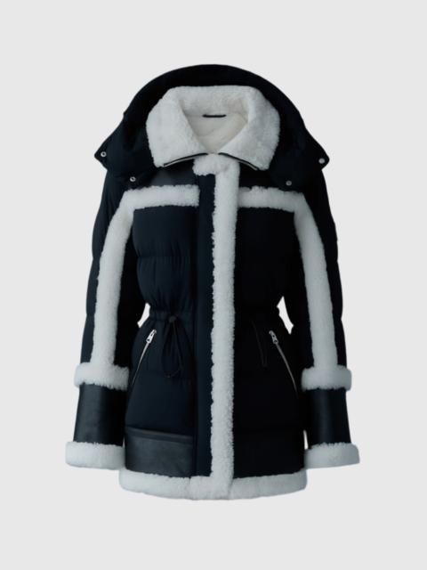 LILIBETH is a mixed-media recycled quilted down parka with plush shearling detailing throughout. Water-resistant and repellent, a storm visor hood and adjustable bungee at waist add utilitarian performance and create a striking silhouette. Expertly tailored, a hybrid winter staple with a contemporary cut. DETAILS - Mid-length mixed media quilted down parka - Shearling-trimmed stand collar with removable hood - Shearling trim around back yoke, bottom hem and sleeve hems - Center front zip closure with leather tape - Shearling detailed placket - Insulated zip waist pockets - Signature M logo patch on left sleeve - Relaxed fit - Down to -15°C SIZE & FIT - REGULAR – Classic fit allowing comfort and style. - Designed to be worn with heavier layers. - The model is 5'11" (180 cm) and wears a size XS. - Coat length from shoulder to hem: 29.75'' / 76 cm. COMPOSITION & CARE - Shell: 82% recycled nylon, 18% elastane/spandex. Combo shell: 100% sheepskin. Combo: 100% lamb leather. Lining: 82% recycled nylon, 18% elastane/spandex. Filling: 90% duck down, 10% feathers. Water-repellent and water-resistant. - Dry clean by leather specialist using oil-based solvent only. Do not use perchloroethylene.