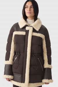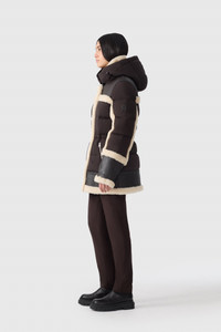 LILIBETH is a mixed-media recycled quilted down parka with plush shearling detailing throughout. Water-resistant and repellent, a storm visor hood and adjustable bungee at waist add utilitarian performance and create a striking silhouette. Expertly tailored, a hybrid winter staple with a contemporary cut. DETAILS - Mid-length mixed media quilted down parka - Shearling-trimmed stand collar with removable hood - Shearling trim around back yoke, bottom hem and sleeve hems - Center front zip closure with leather tape - Shearling detailed placket - Insulated zip waist pockets - Signature M logo patch on left sleeve - Relaxed fit - Down to -15°C SIZE & FIT - REGULAR – Classic fit allowing comfort and style. - Designed to be worn with heavier layers. - The model is 5'11" (180 cm) and wears a size XS. - Coat length from shoulder to hem: 29.75'' / 76 cm. COMPOSITION & CARE - Shell: 82% recycled nylon, 18% elastane/spandex. Combo shell: 100% sheepskin. Combo: 100% lamb leather. Lining: 82% recycled nylon, 18% elastane/spandex. Filling: 90% duck down, 10% feathers. Water-repellent and water-resistant. - Dry clean by leather specialist using oil-based solvent only. Do not use perchloroethylene.