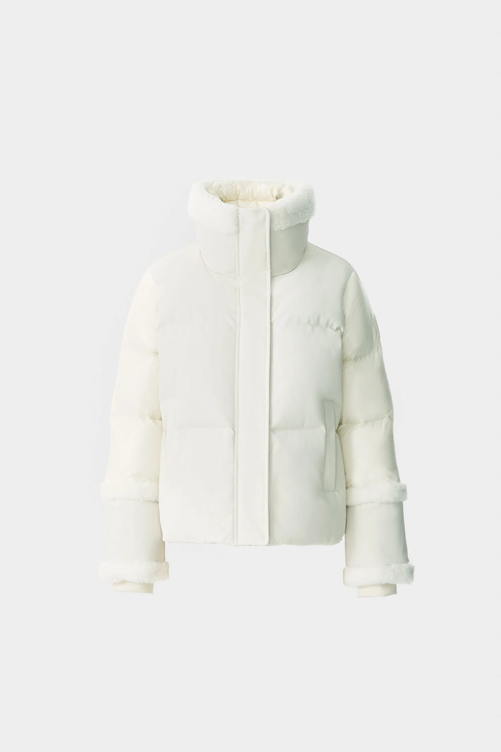 LYDANA is a down winter jacket with a detachable down lustrous bib. Crafted from a protective 2-layer twill shell fabric, it features contrast textures, shearling trim detailing, and water-repellent material. Storm cuffs offer added protection, while zippered welt pockets and inner storage lend practical comfort. DETAILS - Medium down jacket - 2-layer twill shell fabric - Temperature Rating: -15°C - Water-repellent, resistant, and breathable - Removable light down bib - Shearling trim on cuffs and collar - Contrast fabric at sleeves - Center front zip closure with placket and hidden snaps - PU tape detail at center front zip - Insulated zip welt waist pockets and inner pocket - Storm cuffs - Silicone ‘M’ logo patch at sleeve - Relaxed fit SIZE & FIT - RELAXED – Loose fit for on the go comfort. - Designed to be worn with heavier layers. - The model is 5'11" (180 cm) and wears a size S. - Coat length from shoulder to hem: 24'' / 58 cm. COMPOSITION & CARE - Shell: 100% polyamide/nylon. Lining: 100% recycled nylon. Filling: 90% down, 10% feathers. Fur: 100% sheep leather. Water-repellent, water-resistant. - Dry clean by leather specialist using oil based solvent only. Do not use perchloroethylene.