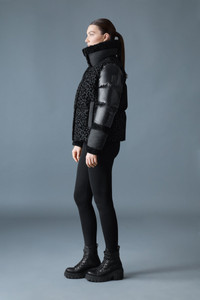 LYDANA-FLP is a down winter jacket with a detachable down lustrous bib. The front and back feature plush novelty flocking, while the sleeves are cut from recycled lustrous fabric. The collar and cuffs are rendered in twill fabric. Shearling trim at the hood and storm cuffs adds warmth and texture, while zippered welt pockets and interior storage offer discreet utility. DETAILS - Medium down jacket - Temperature Rating: -15°C - Water-repellent, resistant, and breathable - Removable light down bib - Novelty flocking fabric with contrast sleeves - Twill fabric and shearling trim at cuffs and collar - Center front zip closure with placket and hidden snaps - PU tape detail at center front zip - Insulated zip welt waist pockets and inner pocket - Rib knit storm cuffs - Mackage silicone ‘M’ logo at sleeve - Relaxed fit SIZE & FIT - RELAXED – Loose fit for on the go comfort. - Designed to be worn with heavier layers. - The model is 5'11" (180 cm) and wears a size S. - Coat length from shoulder to hem: 24'' / 76 cm. COMPOSITION & CARE - Shell: 100% recycled polyester. Lining: 100% recycled nylon. Filling: 90% recycled down, 10% recycled feathers. Fur : 100% sheep leather. Water-repellent, water-resistant. - Dry clean by leather specialist using oil based solvent only. Do not use perchloroethylene.
