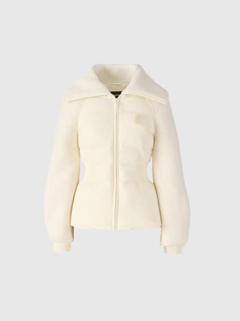 FOXY is a mixed-media jacket featuring a recycled light down front and back. An expertly tailored indoor-outdoor style with knit sleeves and collar. The smocked elasticized detail at waist creates a cinched silhouette while insulated balloon sleeves add modern styling and warmth. - Mixed-media jacket - GRS-certified recycled down - Water-repellent, resistant, and windproof - Knit sleeves, back, and collar - Balloon insulate sleeves - Smocked elasticized detail at waist - Centre front zip front closure - Zip waist pockets - Signature M logo at chest - Fitted cut - Down to -15°C SIZE & FIT - FITTED – Our signature fit, closest to the body. - Designed to be worn with light layers, all while keeping you warm. - For heavier layering, we recommend sizing up. - The model is 5'11" (180 cm) and wears a size XS. - Coat length from shoulder to hem: 25'' / 64 cm. COMPOSITION & CARE INSTRUCTIONS - Shell: 82% recycled nylon, 18% elastane/spandex. Combo shell: 100% wool. Lining: 82% recycled nylon, 18% elastane/spandex. Filling: 90% duck down, 10% feathers. Water-repellent and water-resistant. - Dry clean by leather specialist using oil-based solvent only. Do not use perchloroethylene.