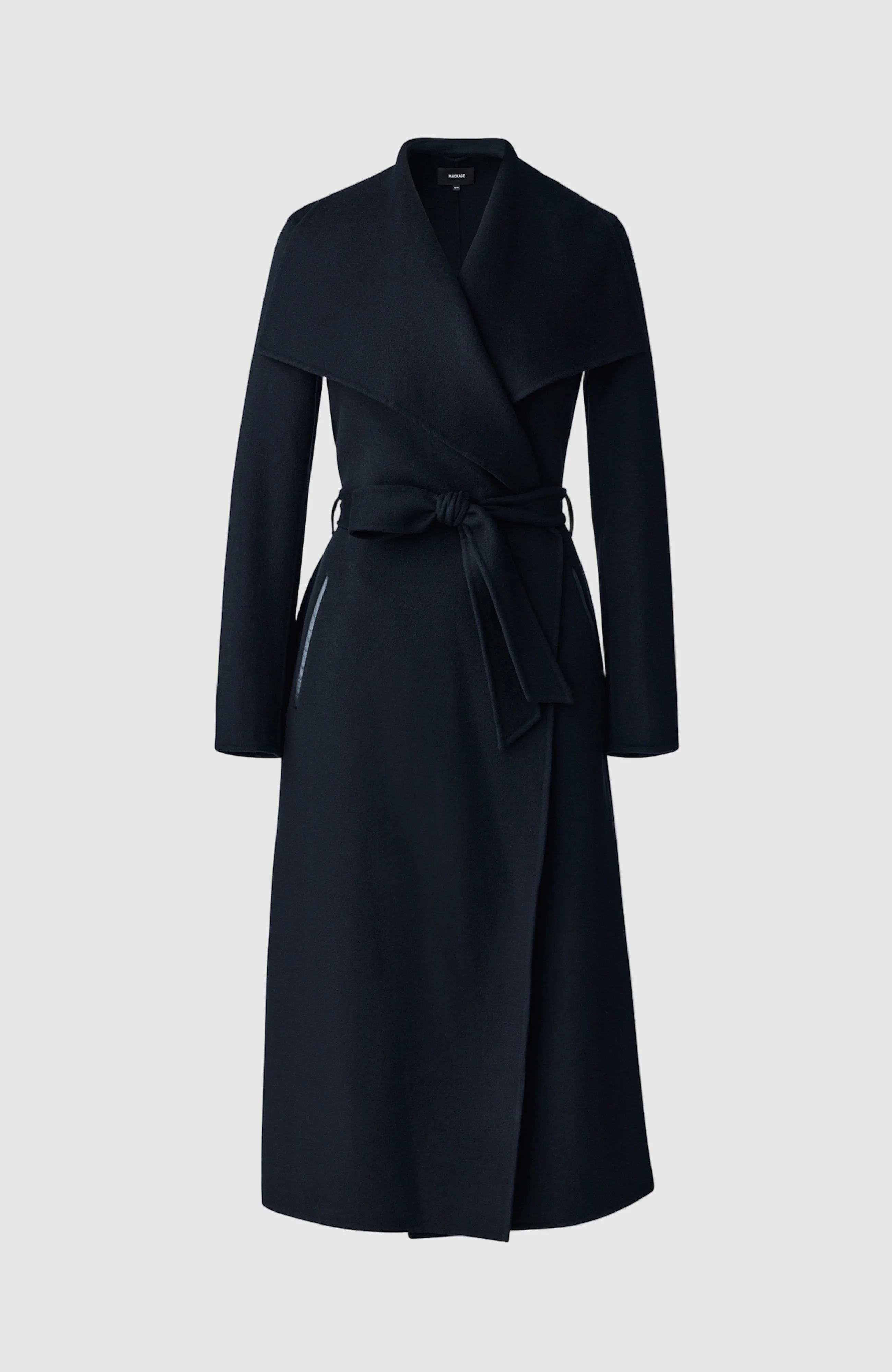 MAI-CN is a long wrap coat for women handmade from luxurious soft double-face wool. The fluid drape provides a relaxed-fit and unlined layer for maximum comfort in mild climates. The waterfall collar adds a sophisticated appeal while leather welting highlights the waist pockets and belt loops. DETAILS - Long wrap coat - Soft double-face wool - Handmade - Waterfall collar - Wool sash belt - (R) Leather and wool belt loops - Waist pockets with leather trim - Unlined - Relaxed fit SIZE & FIT - RELAXED – Loose fit for on the go comfort. - Designed to be worn with heavier layers. - The model is 5'11" (180 cm) and wears a size XS. - Length from shoulder to hem: 47 ½'' / 120 cm. COMPOSITION & CARE - Shell: 100% wool. Combo: 100% lamb leather. - Dry clean by leather specialist using oil-based solvent only. Do not use perchloroethylene.