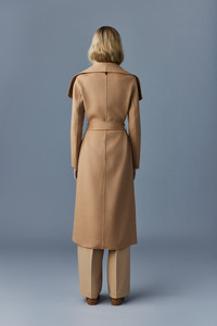MAI-CN is a long wrap coat for women handmade from luxurious soft double-face wool. The fluid drape provides a relaxed-fit and unlined layer for maximum comfort in mild climates. The waterfall collar adds a sophisticated appeal while leather welting highlights the waist pockets and belt loops. - Long wrap coat - Soft double-face wool - Handmade - Waterfall collar - Wool and leather sash belt - (R) Leather and wool belt loops - Waist pockets with leather trim - Unlined - Relaxed fit SIZE & FIT - RELAXED – Loose fit for on the go comfort. - Designed to be worn with heavier layers. - The model is 5'11" (180 cm) and wears a size XS. - Length from shoulder to hem: 47 ½'' / 120 cm. COMPOSITION & CARE INSTRUCTIONS - Shell: 100% wool. Combo: 100% lamb leather. - Dry clean by leather specialist using oil-based solvent only. Do not use perchloroethylene.