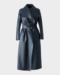- The "Mai-L" wrap coat by Mackage is the perfect sophisticated statement piece crafted from luxurious lambskin leather. - Waterfall collar - Long sleeves - Adjustable, removable self-tie belt - Relaxed fit - Hem falls below the knee - Wrap closure - Leather/wool - Unlined - Leather method dry cleaning - Imported