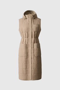 MAKANA is a semi-fitted long vest crafted from recycled nylon and filled with GRS certified recycled down, providing warmth in mild to cold climates. The vest features a stand collar with a removable hood and an adjustable bungee at the waist for a tailored silhouette. Patch pockets and a chest pocket provide practical features for day-to-day wear. Additional details include side vents with snaps for mobility and a center front snap closure for easy wear. The perfect transeasonal piece. - Long recycled down vest - 2-way stretch material - Temperature rating: +5°C - GRS certified recycled down fill - Removable hood with adjustable bungee - Stand collar - Binding at hood - Binding side seam detail - Vertical quilting - Quilted body - Patch pockets and chest pocket - Vertical quilting for added texture - Snap front closure - Side vents with snaps - Silicone "MACKAGE" branding SIZE & FIT - SEMI-FITTED – Follows your body’s shape for ease of movement. - Designed tolayer with a fitted top or light sweater. - The model is 5'11" (180 cm) and wears a size S. - Coat length from shoulder to hem: 44 ¼'' / 113 cm. COMPOSITION & CARE INSTRUCTIONS - Shell: 82% recycled nylon, 18% elastane/spandex. Filling: 90% down, 10% duck feathers. Water repellant & water resistant. - Close zippers. Remove fur. Remove all removable trims. Wash inside out. Wash in domestic machine in water not exceeding 40°C, at normal setting. Use mild detergent. Remove immediately after washing. Do not soak. Tumble dry low heat with tennis balls, until fully dried (1 to 3 hours). Do not wet-clean. Do not bleach. Do not wring. Do not iron or press. Dry clean using oil-based solvent only. Do not use perchloroethylene.
