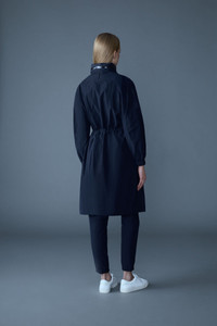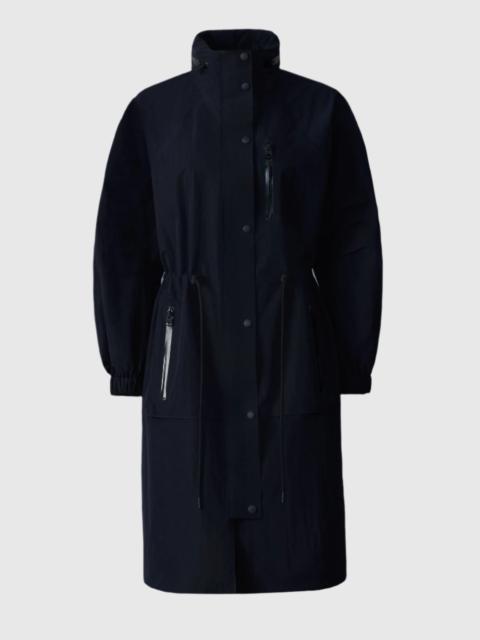 MAKAYLA is a lightweight ripstop, knee-length rain jacket crafted from recycled materials for sustainable style. Featuring a hidden hood inside the collar, water-resistant zippers, and a streamlined front placket with snaps for water-repellent coverage. An adjustable drawcord waist and elasticized cuffs enhance fit and comfort, while dual patch pockets provide practical functionality. Finished with tonal MACKAGE embroidery along the placket for an understated branded touch. DETAILS - Lightweight knee-length rain jacket - Hidden hood inside collar - Seam-sealed construction with water-resistant zippers - Adjustable drawcord waist and elastic cuffs - Dual patch pockets with silicone "MACKAGE" branding - Tonal MACKAGE embroidery along placket SIZE & FIT - RELAXED – Loose fit for on the go comfort. - Designed to be worn with heavier layers. - The model is 5'11" (180 cm) and wears a size S. - Coat length from shoulder to hem: 40 ¼'' / 103 cm. COMPOSITION & CARE - Shell: 75% recycled polyamide, 25% polyamide/ nylon. Waterproof, water-repellant & water-resistant. - Dry clean by a leather specialist using only oil-based solvent. Do not use perchloroethylene.