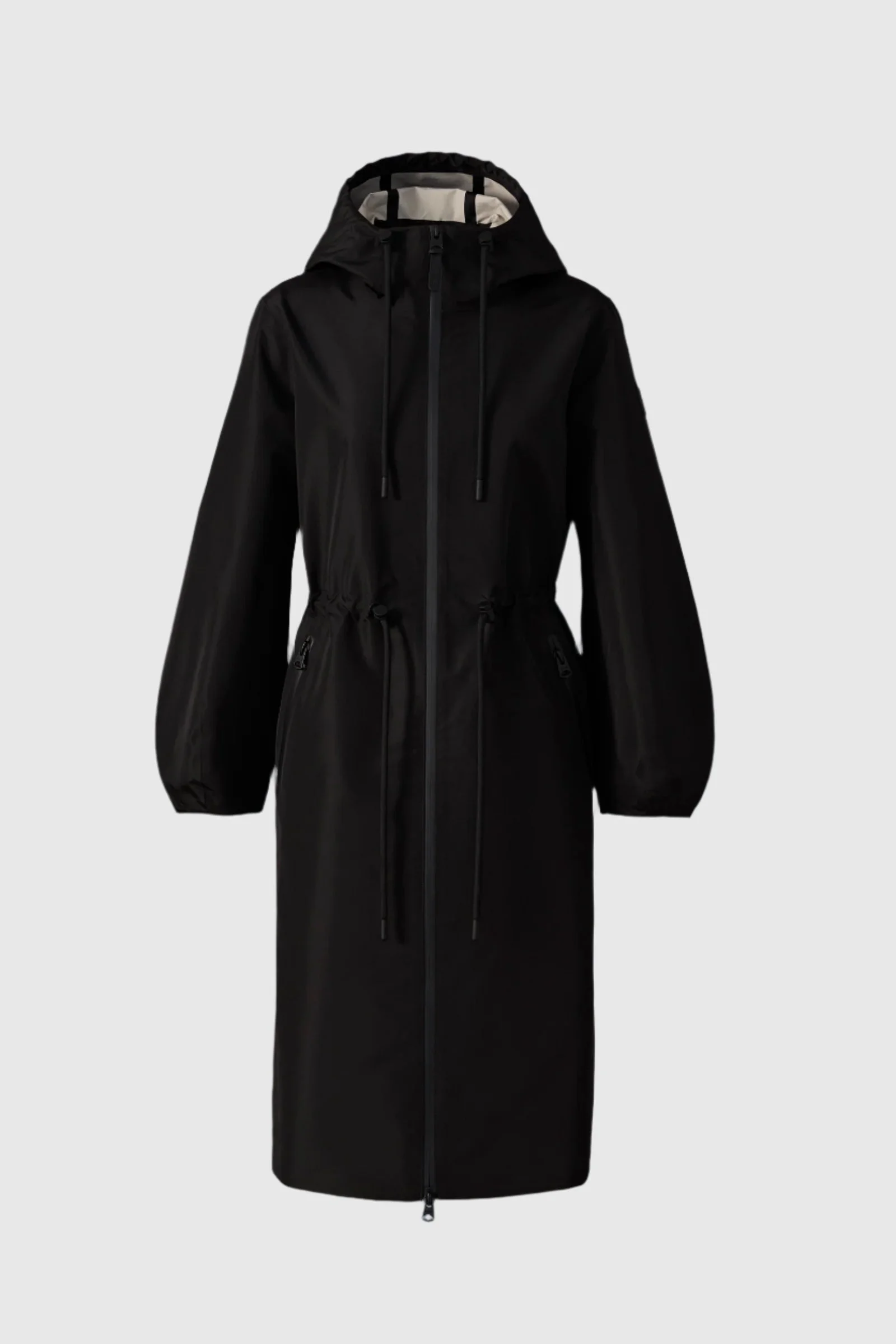 MEKELLE-Z is a long raincoat with a 2-layer tech shell made from 100% recycled materials. Seam-sealed constructed and unlined. It is water resistant, repellent, and windproof. Water-resistant zippers, drawcord at waist and cuffs, and back rainshedder deliver ultimate dryproof protection. Balloon sleeves enhance the modern and design-forward qualities of the coat. DETAILS - Long technical rain jacket - Seam-sealed construction - Water-repellent, resistant, and windproof - 100% recycled 2-layer shell - GRS-certified - Balloon sleeves - Water-resistant zipper at centre front and pockets - Cinched silhouette with adjustable drawcord waist - Rainshedder at back - Drawcord at hood - Adjustable cuffs with bungee fastening - Signature "M" silicone logo at shoulder - Inside pocket - Relaxed-fit - Unlined SIZE & FIT - REGULAR – Classic fit allowing comfort and style. - Designed to be worn with heavier layers. - The model is 5'11" (180 cm) and wears a size XS. - Length from shoulder to hem: 42 ½'' / 108 cm. COMPOSITION & CARE - Shell: 100% recycled polyester. Water-repellent & water-resistant. - Dry clean by leather specialist using oil based solvent only. Do not use perchloroethylene.